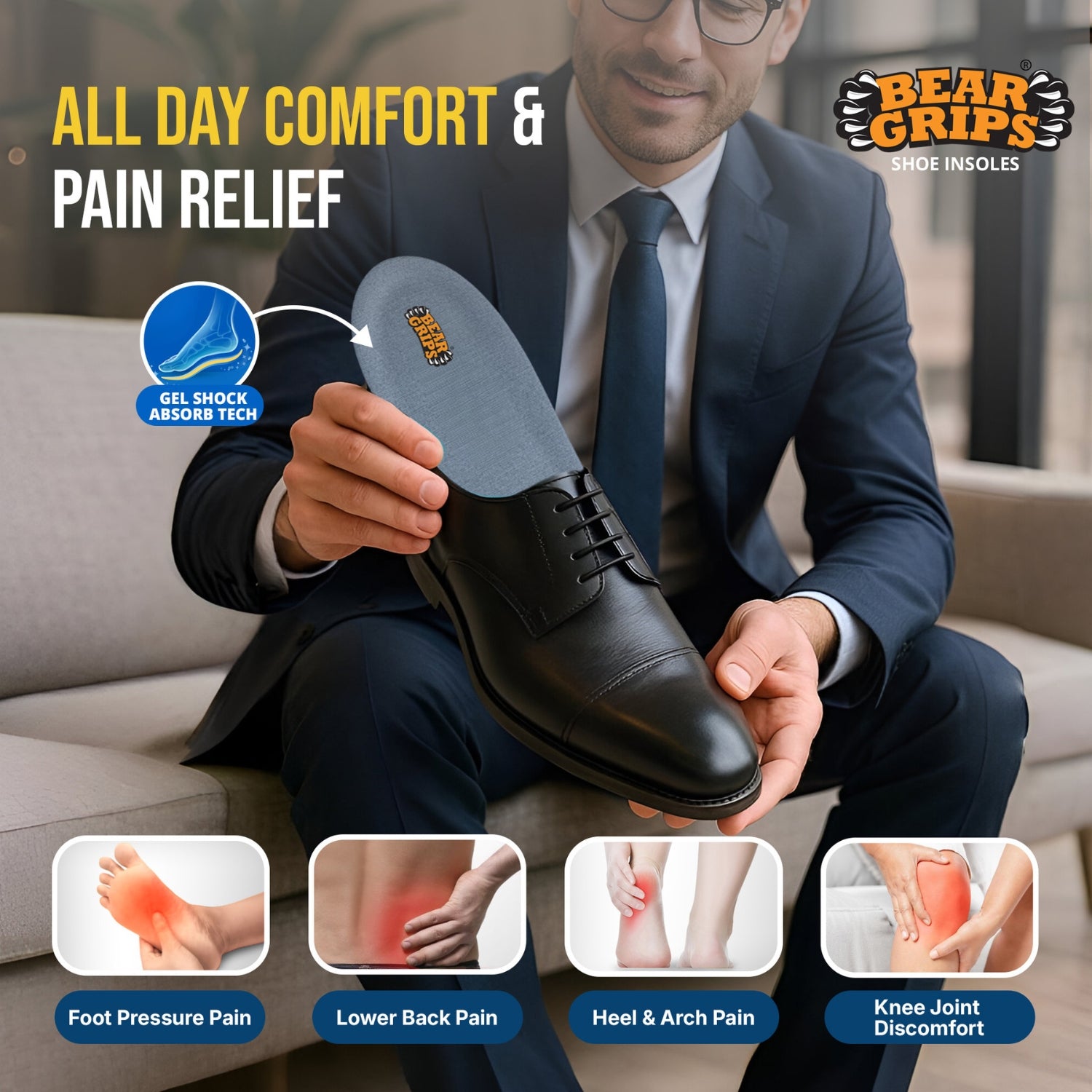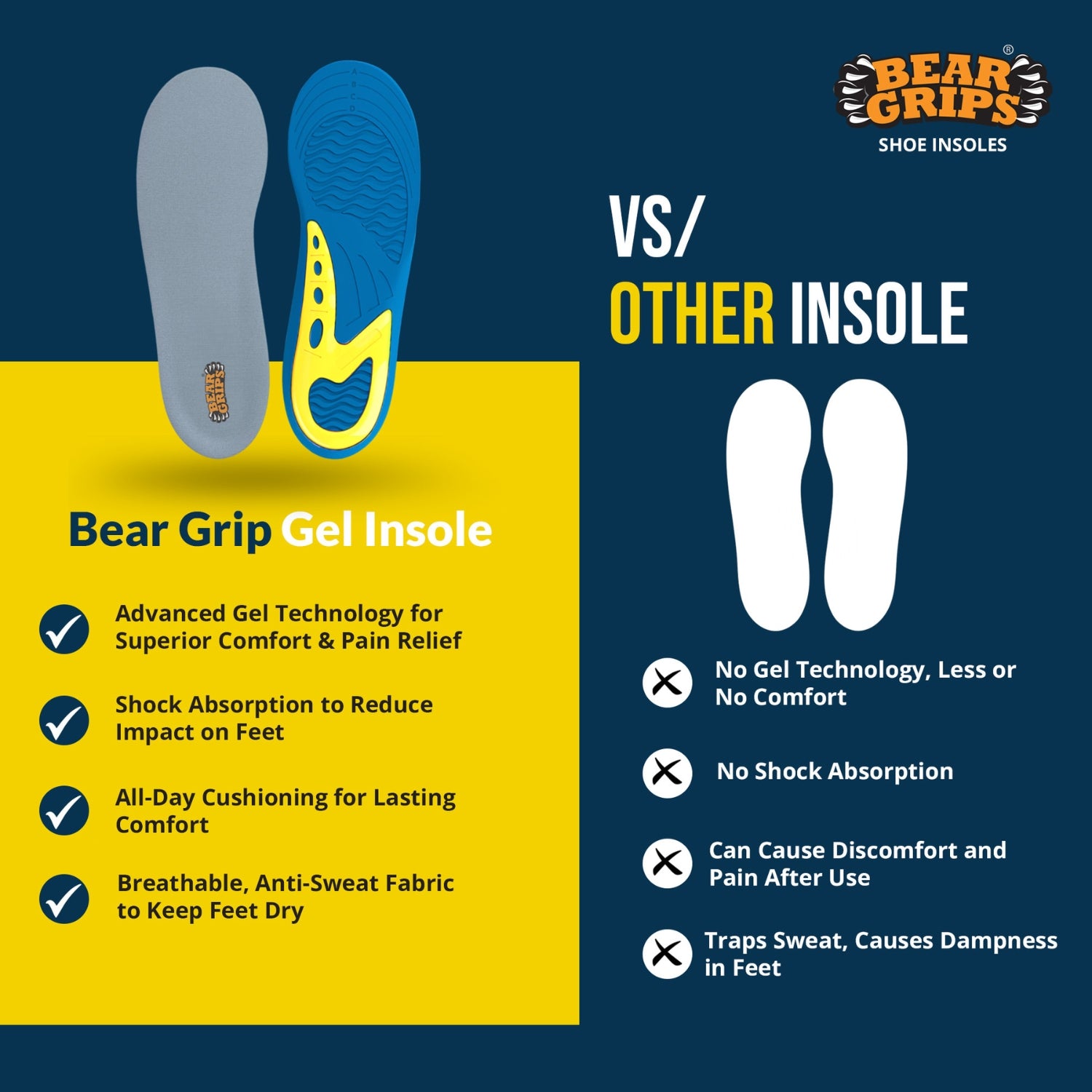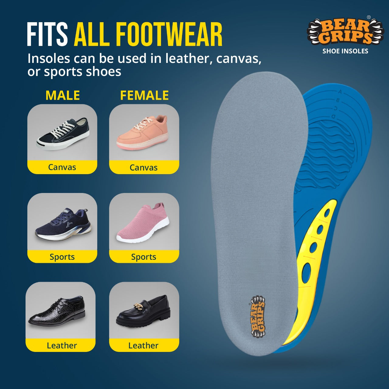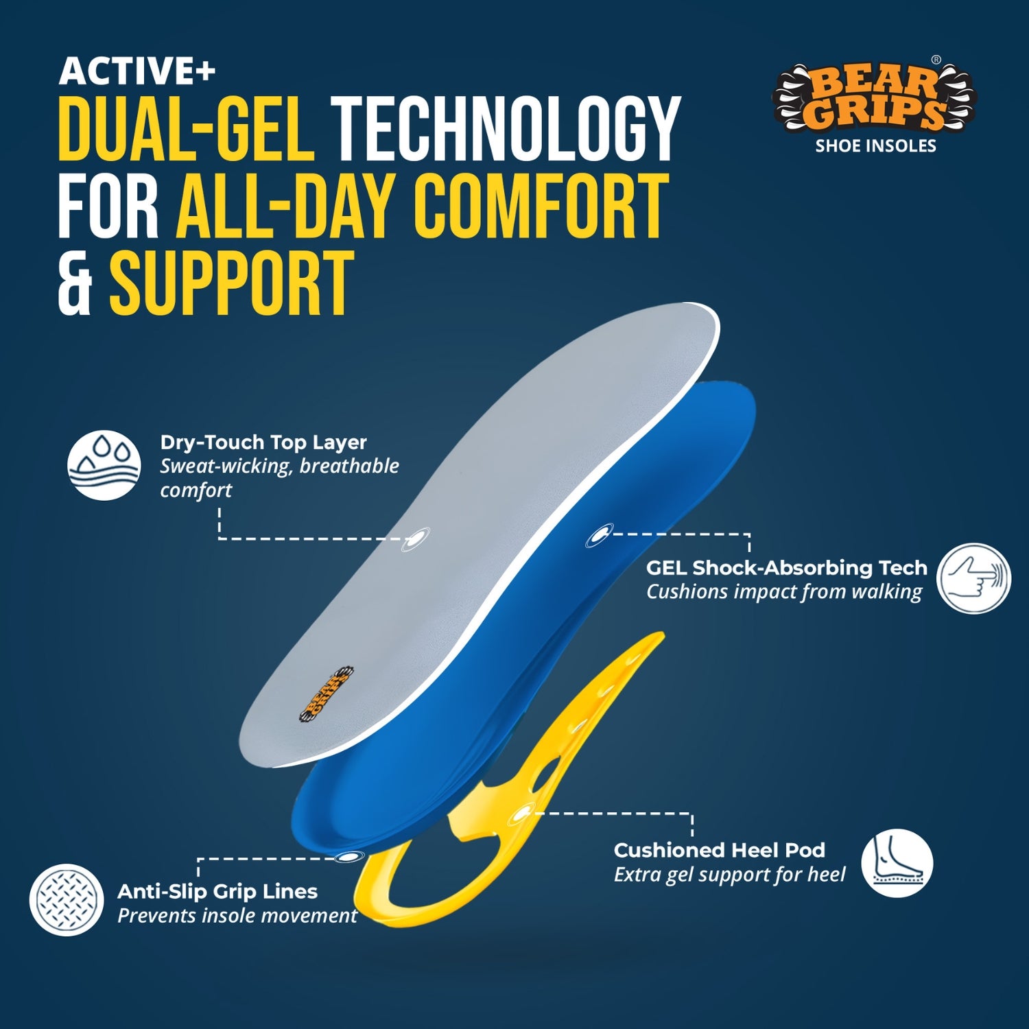 - Dual Gel Arch for Flat Feet & High Arches BEAR GRIPS Arch+ Insoles provide ergonomic support for those with flat feet, high arches, or plantar fasciitis. The dual gel zones offer corrective alignment, reduce overpronation, and relieve heel and arch pain. Ideal for anyone seeking posture correction and comfort in every step.