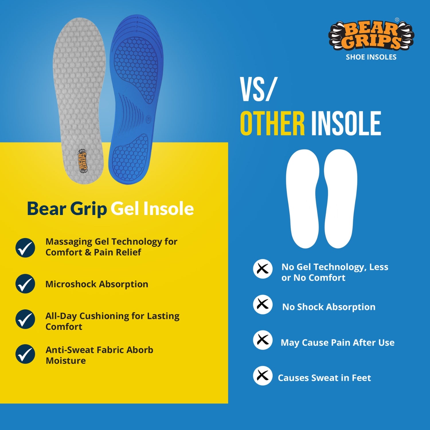 - Supports a Variety of Footwear Styles Use BEAR GRIPS Senior+ insoles in a wide range of shoes—formal leather shoes, casual canvas footwear, or orthopedic sneakers. Whether indoors or outdoors, these insoles deliver unmatched support without compromising fit or comfort. Trim-to-fit design ensures a personalized experience in every shoe.
