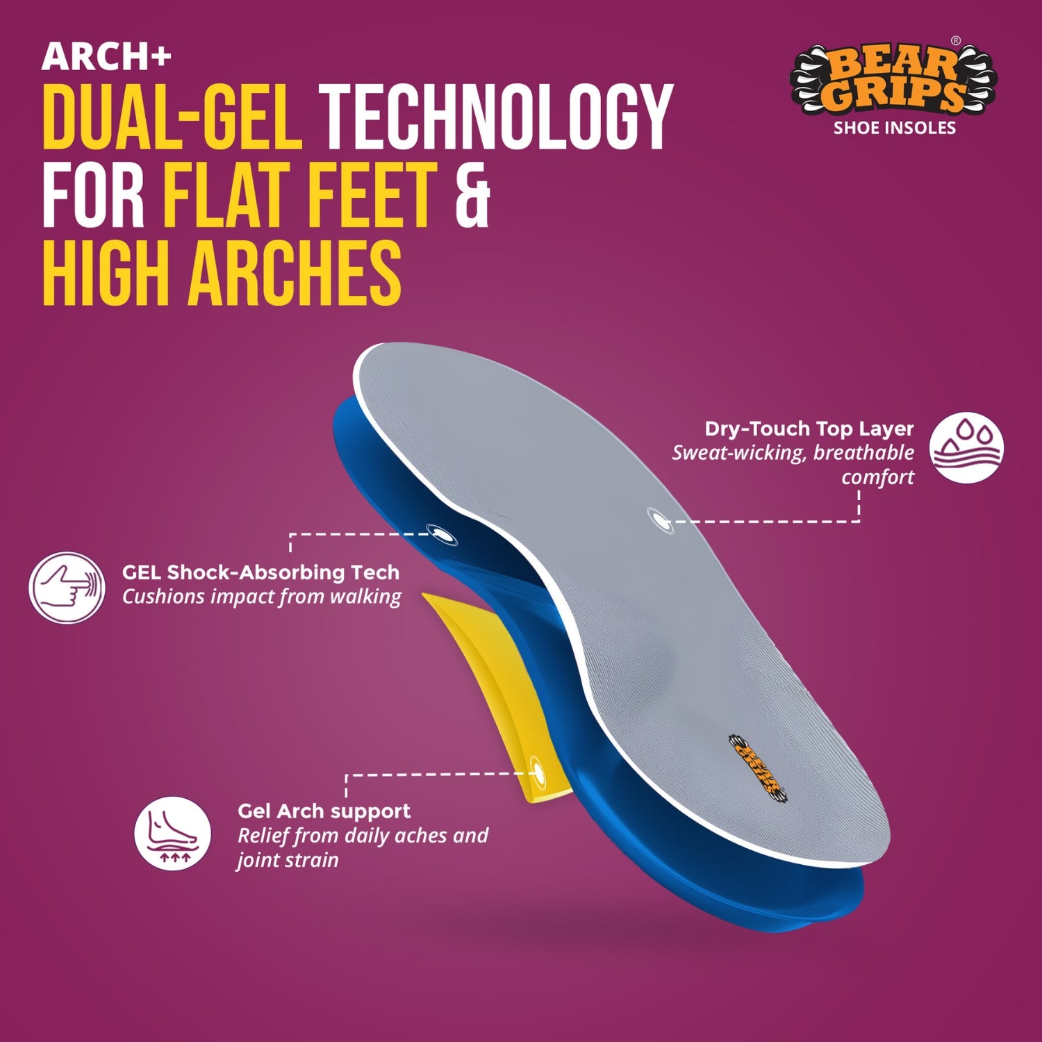 - Dual Gel Arch for Flat Feet & High Arches: BEAR GRIPS Arch+ Insoles provide ergonomic support for those with flat feet, high arches, or plantar fasciitis. The dual gel zones offer corrective alignment, reduce overpronation, and relieve heel and arch pain. Ideal for anyone seeking posture correction and comfort in every step.