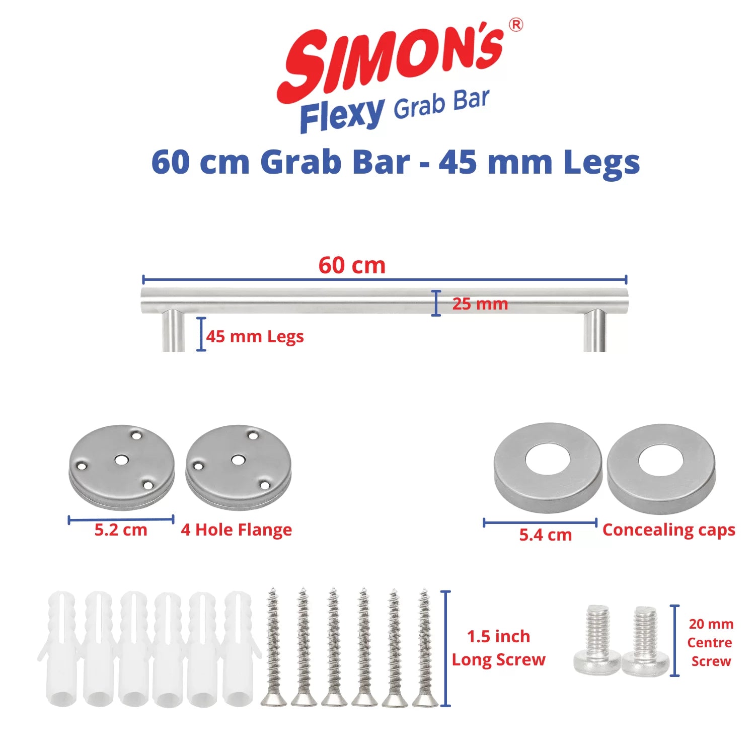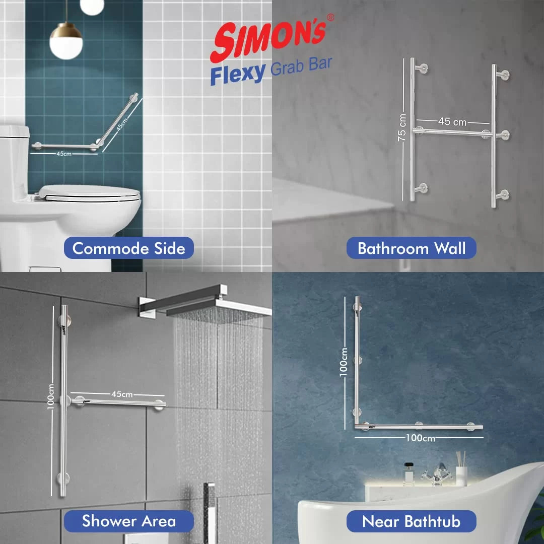 - Simon’s introduces an Innovative concept first time in the World. Combine various sizes to form any shape and cover any area as per your requirement. Pack contains 1 Simon’s Flexy Grab bar of Size: 45 cm length, 25mm diameter and 2 legs height 7.5 cm, 6 no.’s of 1.5-inch heavy-duty SS screws and anchors, 2 SS flanges, and 2 SS concealing caps. The end grooves of the handlebar are made of brass for 100% strength, safety, and durability.