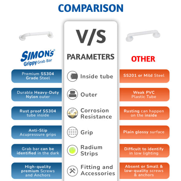 - SIZE OPTIONS: The Simon’s Grab bar is super strong and can support any holding weight easily. It is designed with great precision and international quality standards. The Simon’s Grippy Grab bar comes in 3 different size options : 30 cm, 38 cm, 50 cm and 60cm to suit as per your convenience and requirement.