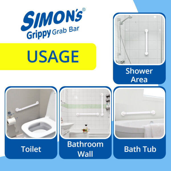 - Pack contains : 1 Simon's Grippy Grab Bar - Small (30cm). The Simon’s Grippy Grab bar are suitable for usage by the elderly and patients requiring support to rise from sitting position in the toilet or support to stand while taking bath or for safety to hold and walk in the bathroom.