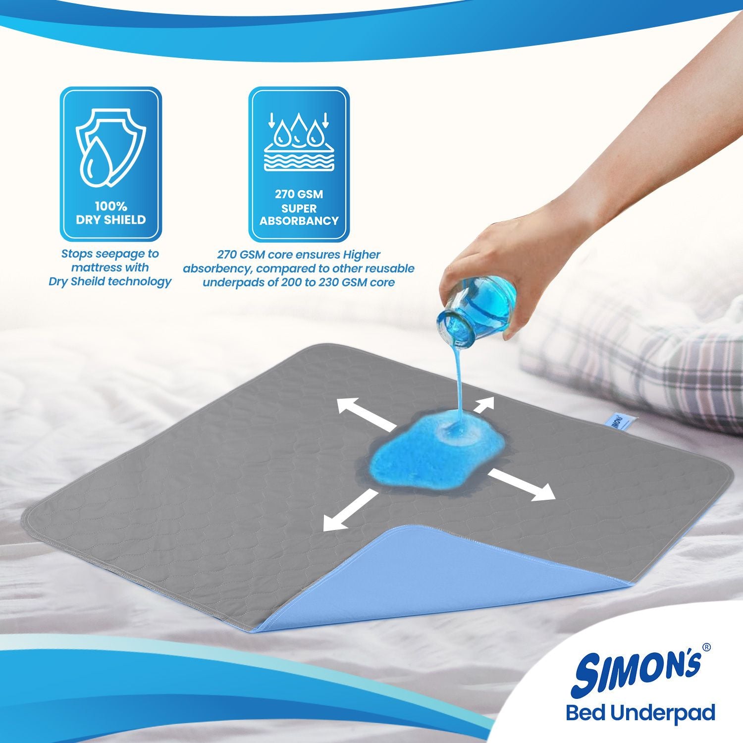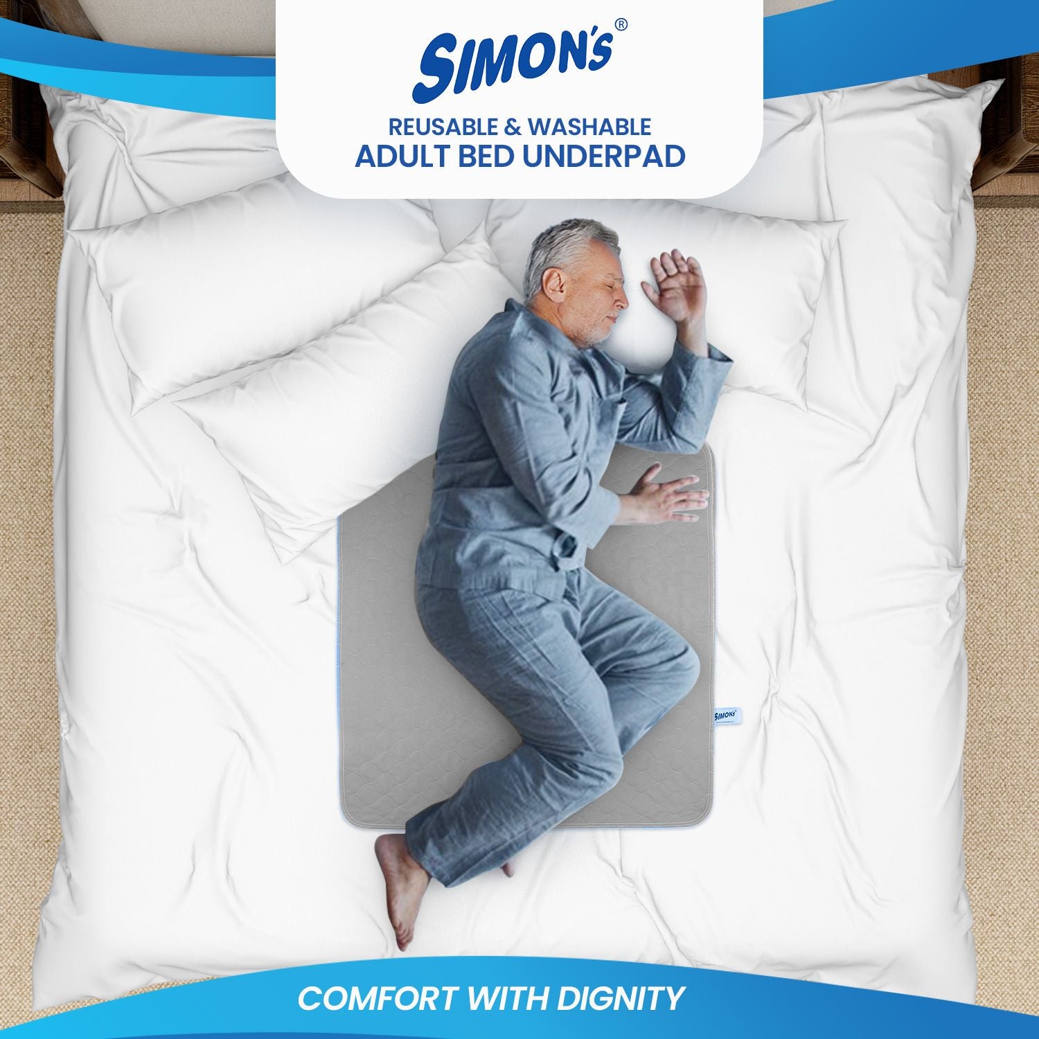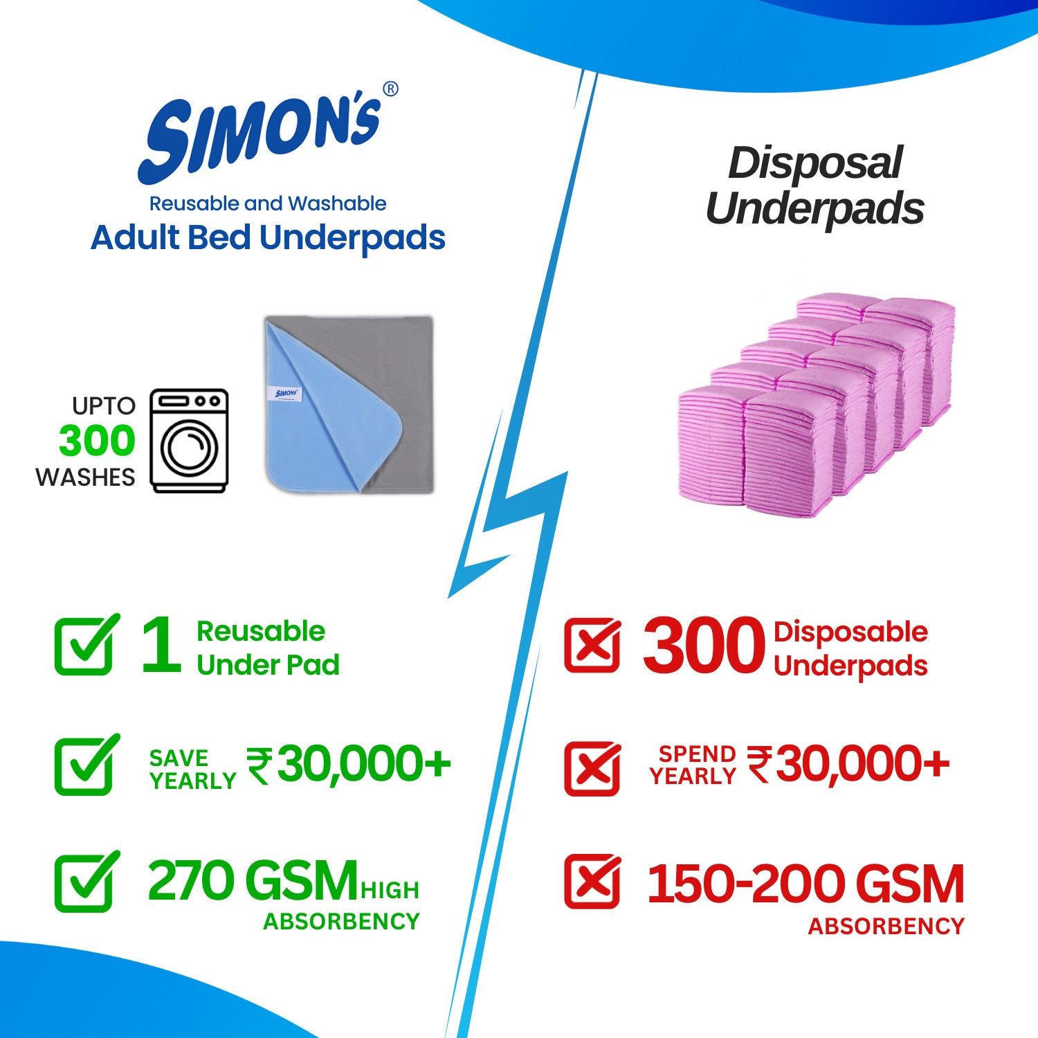 - Re-usable & Economical: Our overnight bed under pads is designed for hassle-free maintenance. It is machine washable and can withstand upto 250-300 washes or 1 year of continuous usage without losing its effectiveness. Designed to be both cost-effective and environmentally safe, 1 Simon?s Reusable Underpad equals to 250 disposable underpads, these pads provide a sustainable solution that saves you money while reducing waste.