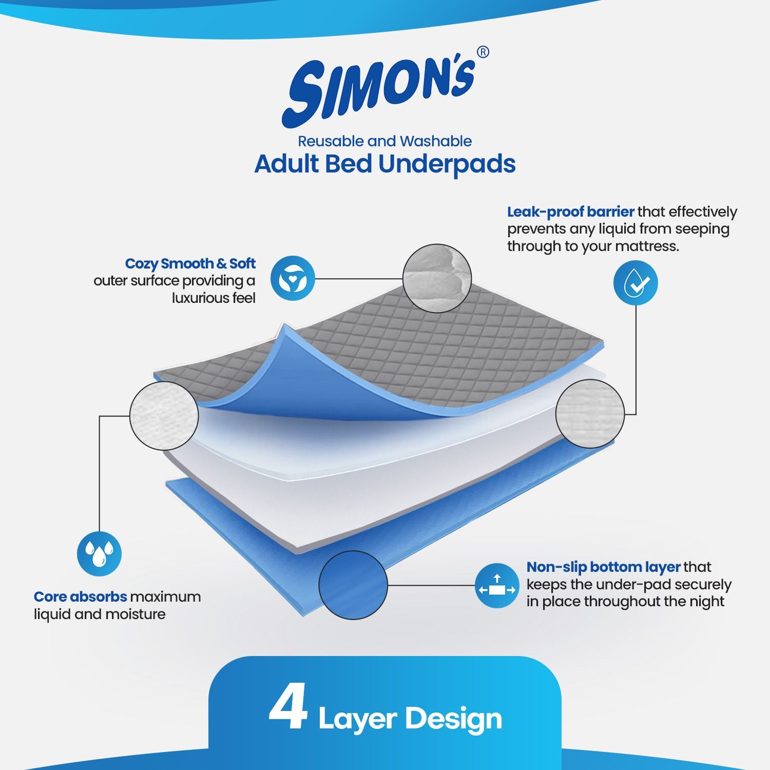 - Advanced 4-Layer Design (4-layer Icon) ? Simon?s Bed under pad is designed with an Innovative 4-Layers design Layer 1 ? Cozy Smooth & Soft outer surface providing a luxurious feel during sleep and on the skin, Layer 2 ? Core absorbs maximum liquid and moisture and keeps the outer surface dry, Layer 3 ? Dry Shield -Leak-proof barrier that effectively prevents any liquid from seeping through to your mattress, Layer 4- Non-slip bottom layer that keeps the under-pad securely in place.
