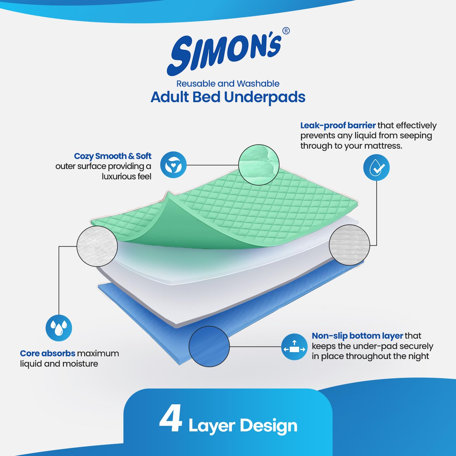 - Advanced 4-Layer Design (4-layer Icon) – Simon’s Bed under pad is designed with an Innovative 4-Layers design Layer 1 – Cozy Smooth & Soft outer surface providing a luxurious feel during sleep and on the skin, Layer 2 – Core absorbs maximum liquid and moisture and keeps the outer surface dry, Layer 3 – Dry Shield -Leak-proof barrier that effectively prevents any liquid from seeping through to your mattress, Layer 4- Non-slip bottom layer that keeps the under-pad securely in place.