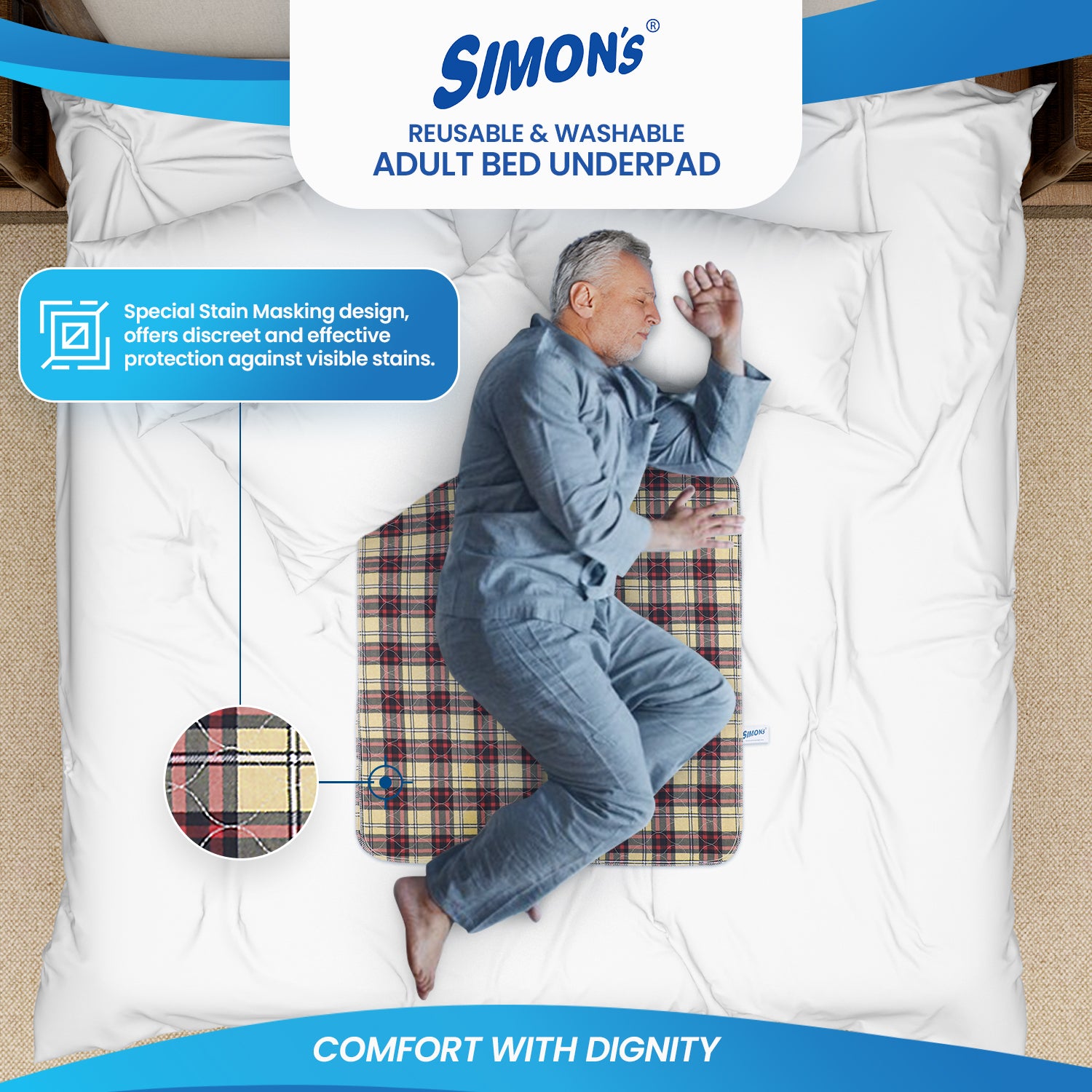 - Re-usable & Economical: Our overnight bed under pads is designed for hassle-free maintenance. It is machine washable and can withstand up to 250-300 washes or 1 year of continuous usage without losing its effectiveness. Designed to be both cost-effective and environmentally safe, 1 Simon’s Reusable Underpad equals to 250 disposable underpads, these pads provide a sustainable solution that saves you money while reducing waste.