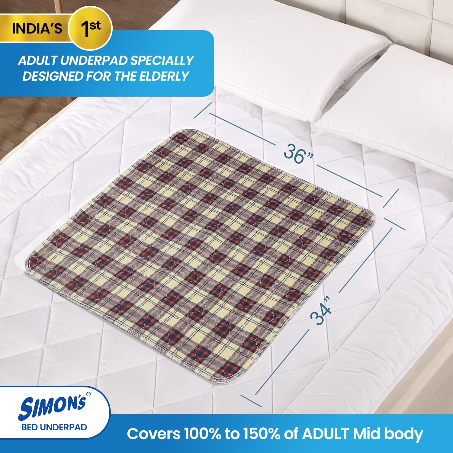 - Designed for the Elderly: Incontinence is an issue faced by most elderly, in which they tend to pass urine accidentally or without restraint during sleep. Simon’s Adult underpads are India’s 1st Underpad designed specifically for the Elderly with Super High absorbency (270 GSM Soaker) and Extra-large size 34 X 36 Inches, covering 100-150% of the mid body of an adult, these underpads absorb and disperse any liquid discharge and keep the surface Dry and protecting from any rashes.