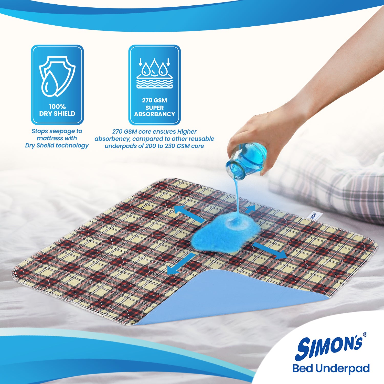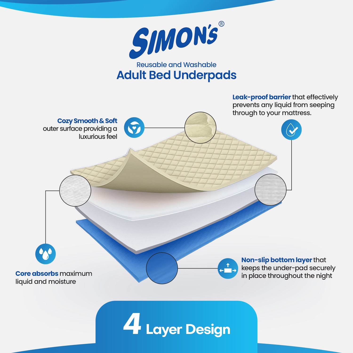 - 4-Layer Design (4-layer Icon) – Simon’s Bed underpad is designed with an Innovative 4-Layers design Layer 1 – Cozy Smooth & Soft outer surface providing a luxurious feel during sleep and on the skin, Layer 2 – Core absorbs maximum liquid and moisture and keeps the outer surface dry, Layer 3 – Dry Shield -Leak-proof barrier that effectively prevents any liquid from seeping through to your mattress, Layer 4- Non-slip bottom layer that keeps the under-pad securely in place throughout the night.