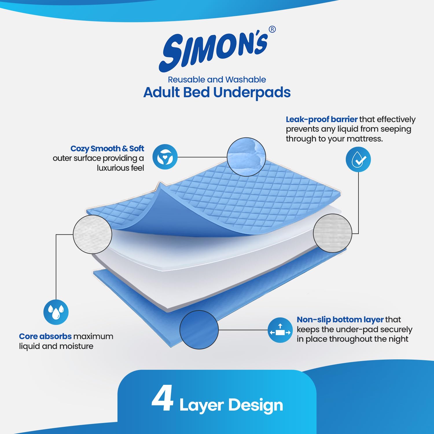 - Advanced 4-Layer Design (4-layer Icon) – Simon’s Bed under pad is designed with an Innovative 4-Layers design Layer 1 – Cozy Smooth & Soft outer surface providing a luxurious feel during sleep and on the skin, Layer 2 – Core absorbs maximum liquid and moisture and keeps the outer surface dry, Layer 3 – Dry Shield -Leak-proof barrier that effectively prevents any liquid from seeping through to your mattress, Layer 4- Non-slip bottom layer that keeps the under-pad securely in place.