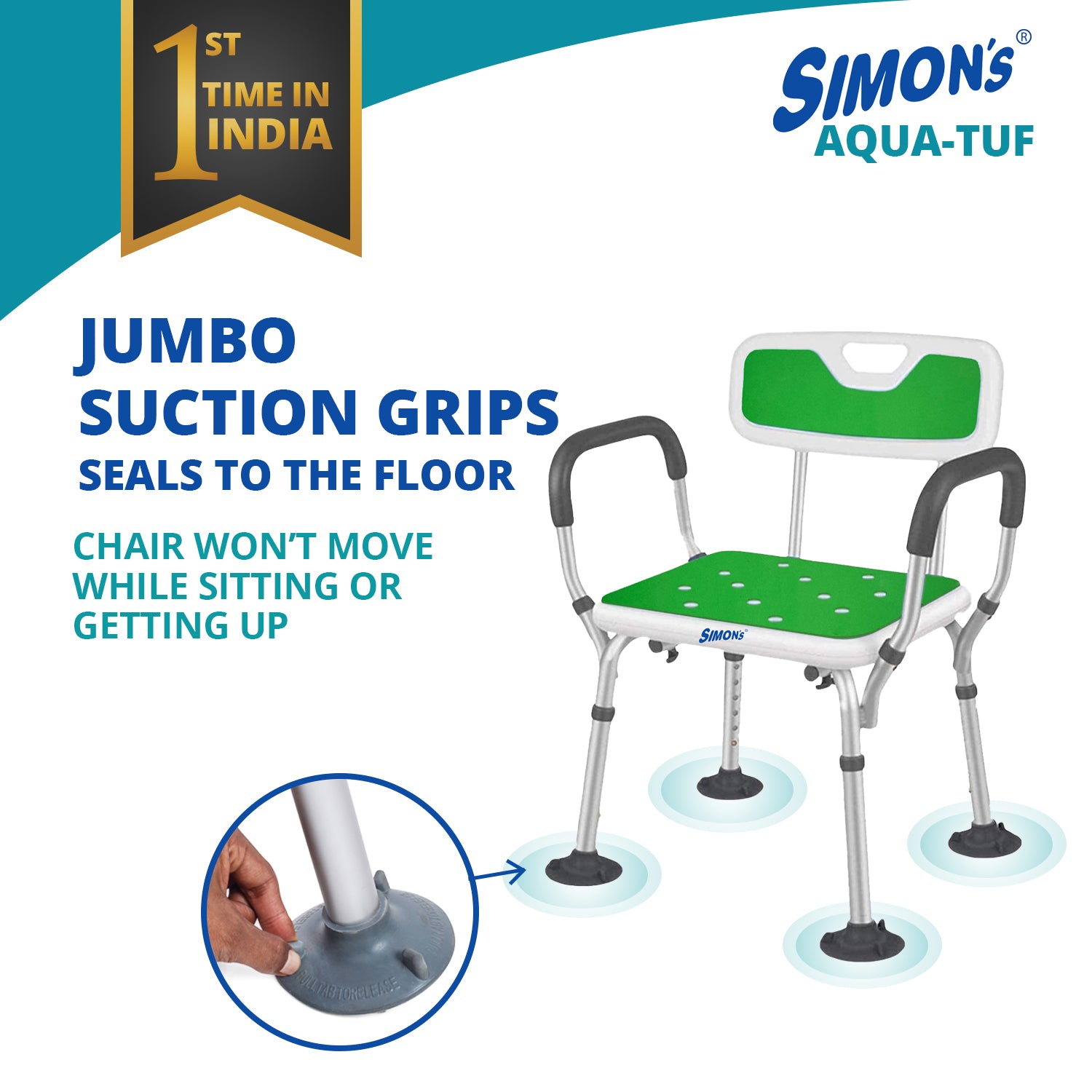 - Safety Power Grips: The Simons AQUA-TUF Bath Chair for the first time in India is fitted with specially designed Jumbo Suction Grips on the base of all four legs. This would ensure the Chair won’t move; once seated suction grips gets sealed. It would prevent the chair from moving or slipping away while sitting down or getting up by senior citizens. It wont budge even while trying to lift it vertically upwards.