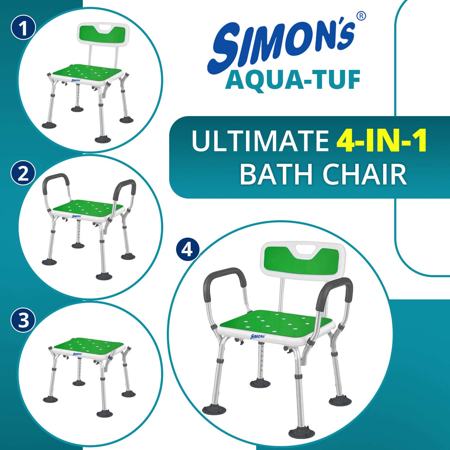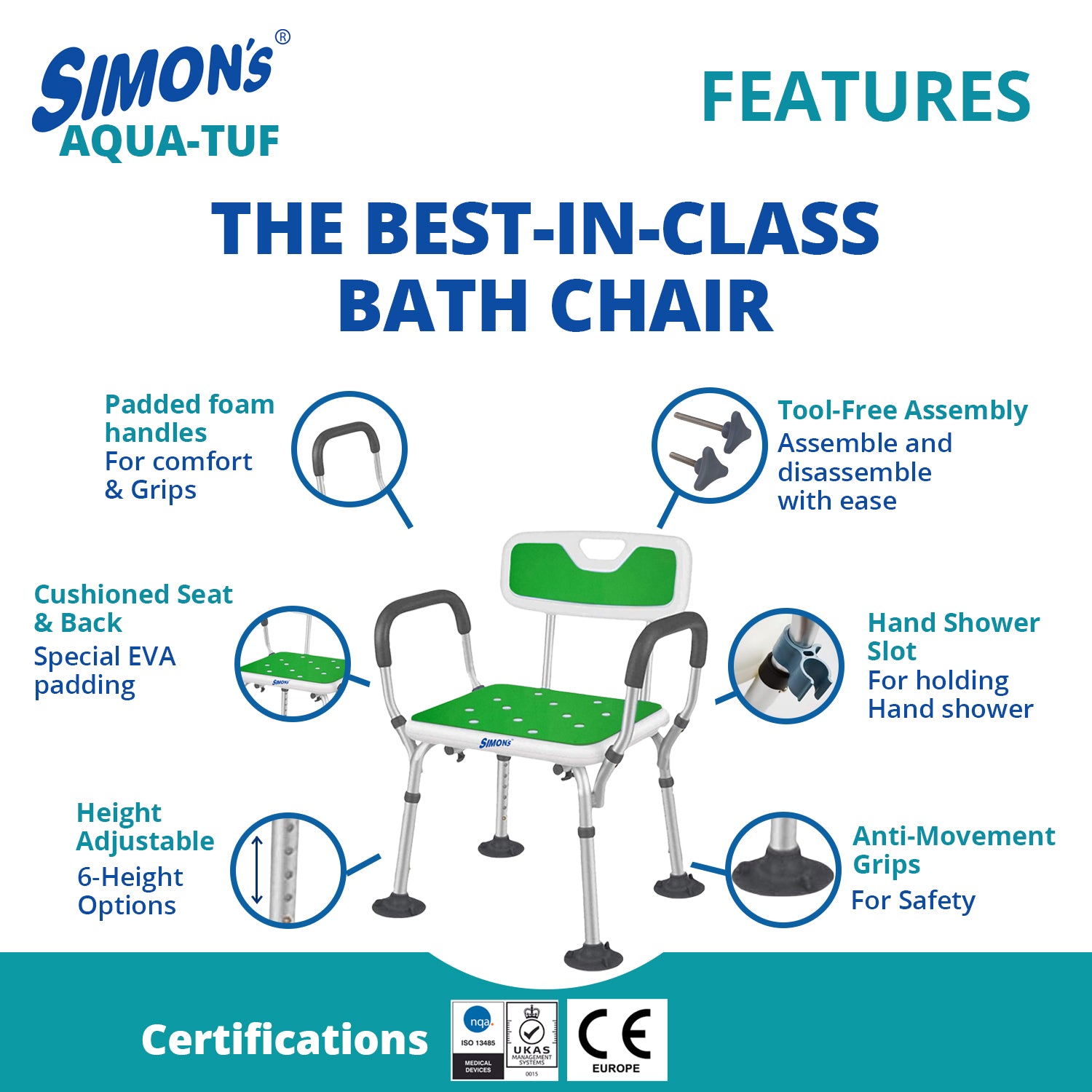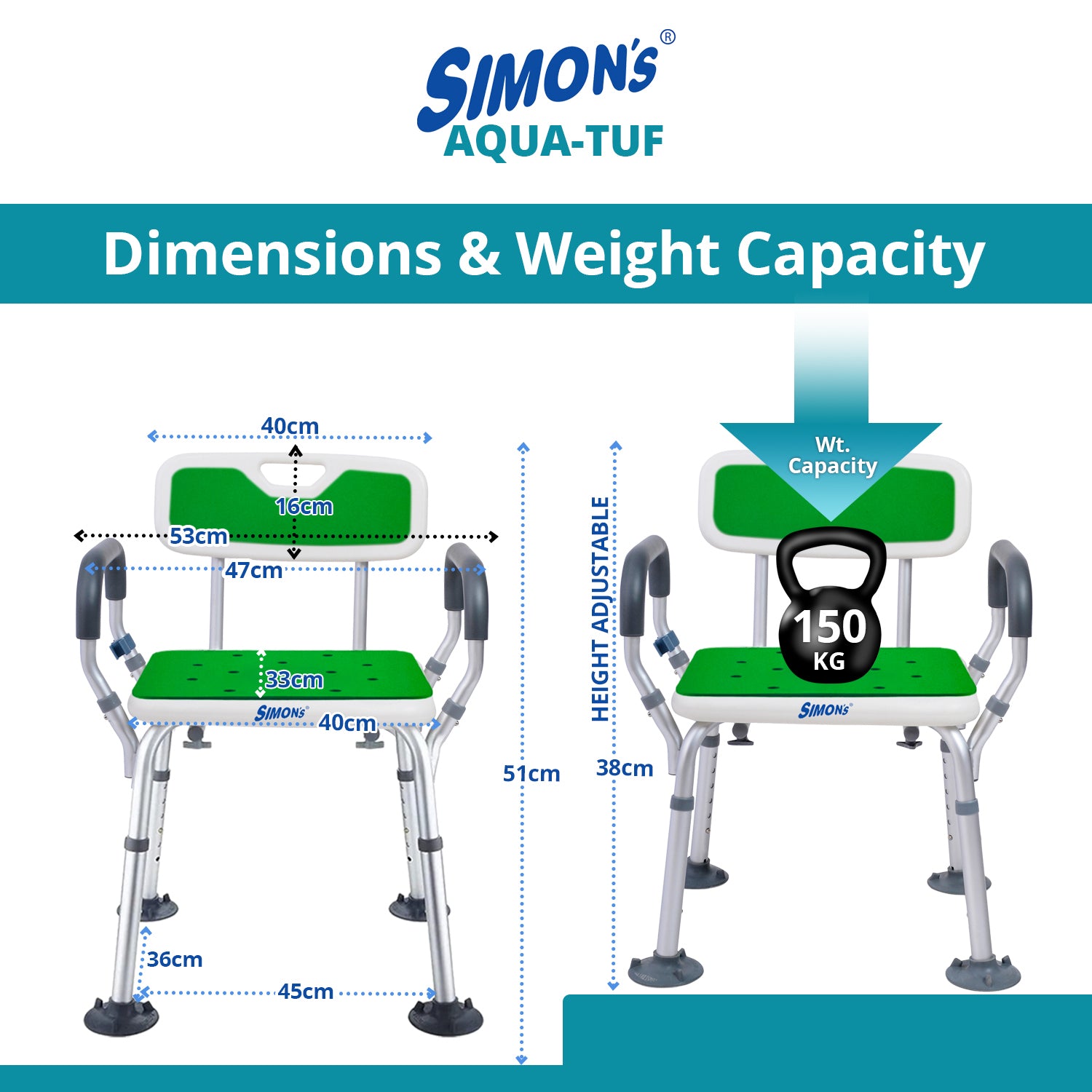 - Heavy-Duty: Simon’s AQUA-TUF bath Chair is designed for the ultimate test of Strength and durability. The Chair is CE and ISO Certified. Its frame is made of Premium-Grade 1.25mm thick Aluminum Alloy material with Heavy-Duty HDPE Seat and back. It can withstand a tested weight capacity of 150 kg with ease. The chair with proper chair can be used for number years without any problem.