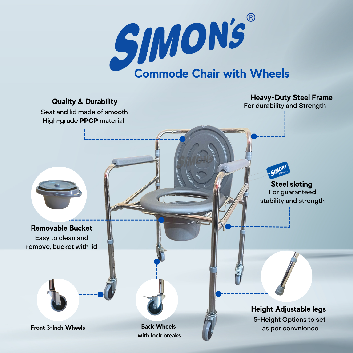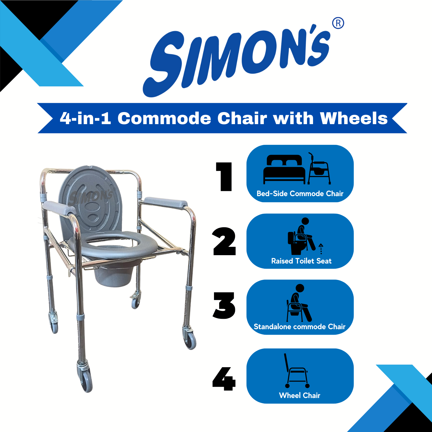 - 4-in-1: The Simon's Classic folding 4-in-1 commode chair with wheels is a versatile and convenient toilet solution for senior citizens and the disabled, it is a practical and reliable option for those who need assistance with toileting, providing independence and dignity. This commode chair can be used as a raised toilet seat, bedside commode, standalone commode or an assisted wheelchair, making it a practical and space-saving option.
