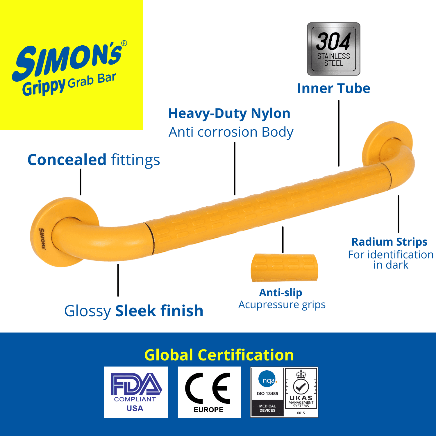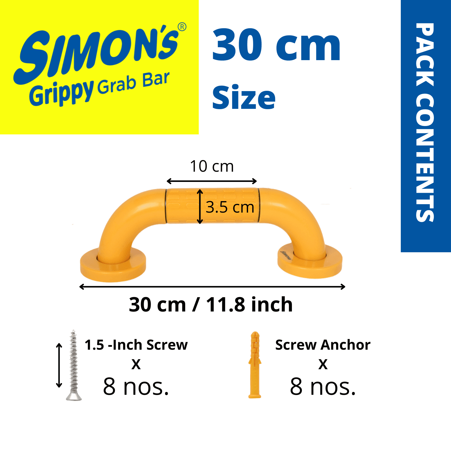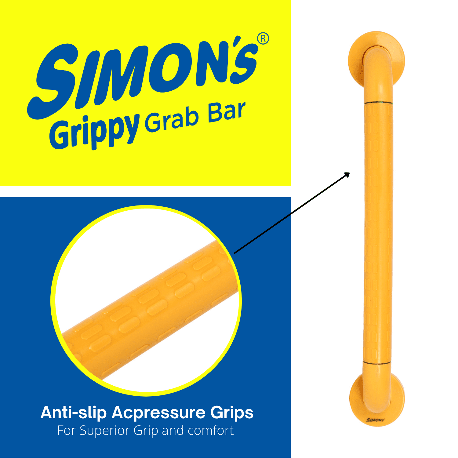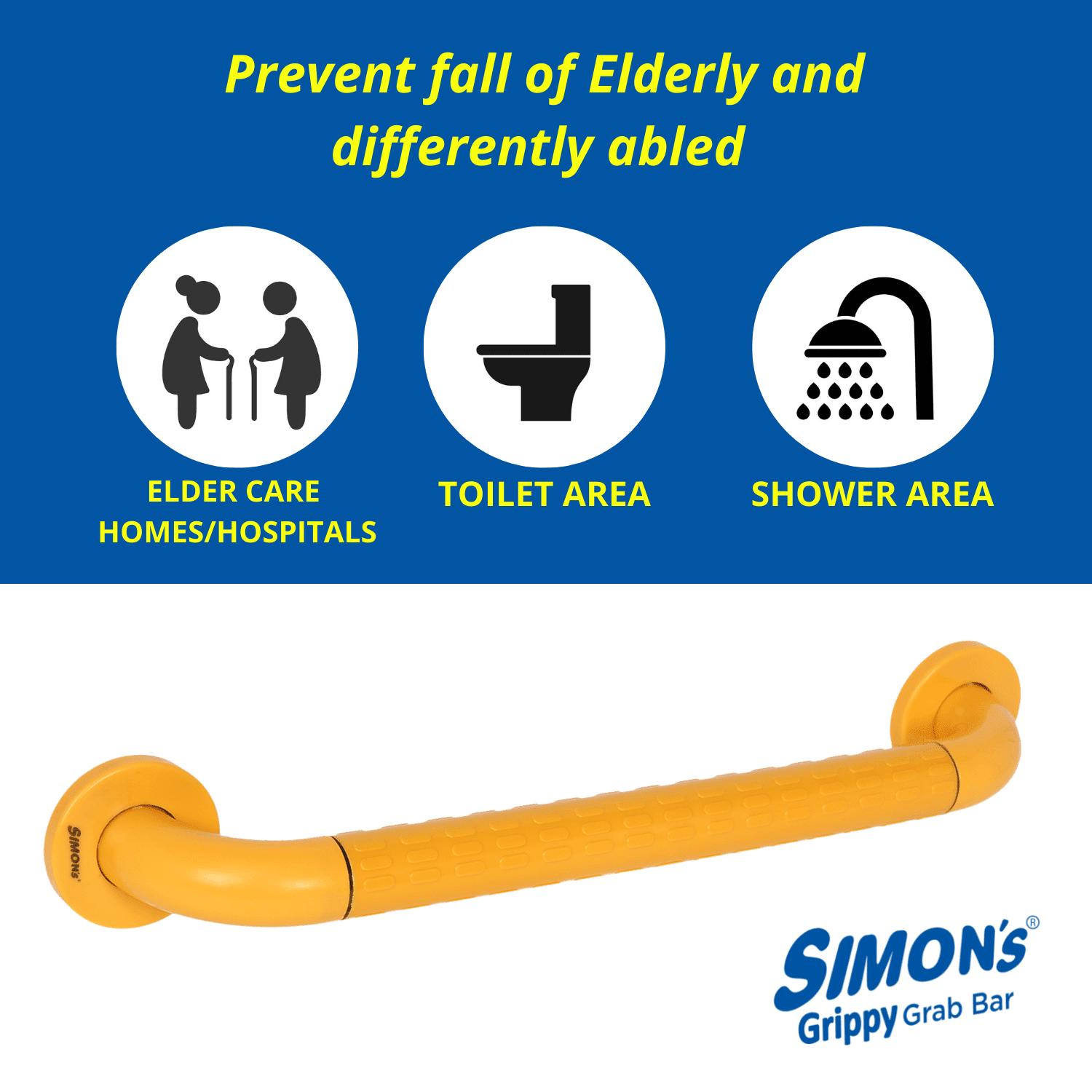 • Pack contains : 1 Simon's Grippy Grab Bar - Small (30cm). The Simon’s Grippy Grab bar are suitable for usage by the elderly and patients requiring support to rise from sitting position in the toilet or support to stand while taking bath or for safety to hold and walk in the bathroom.