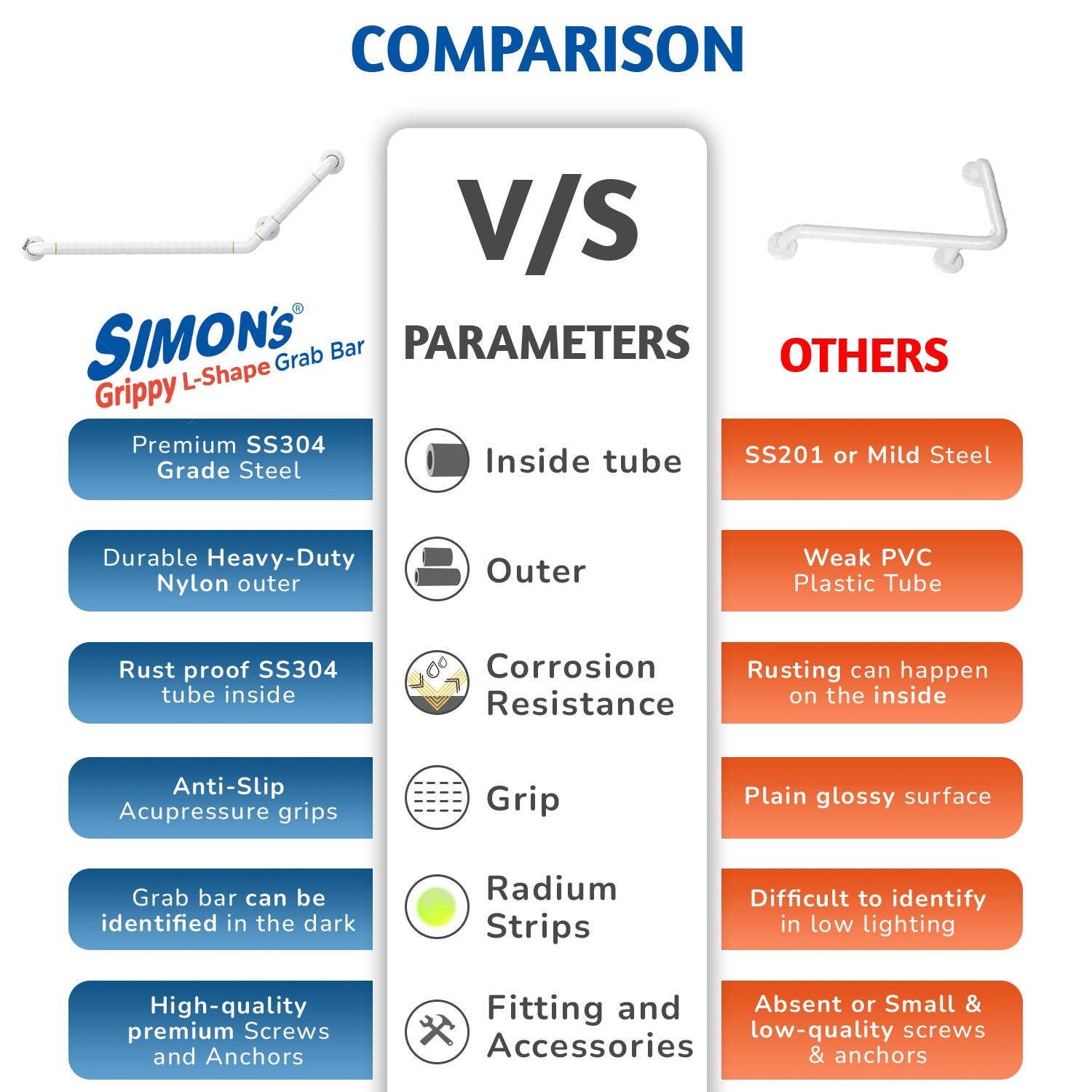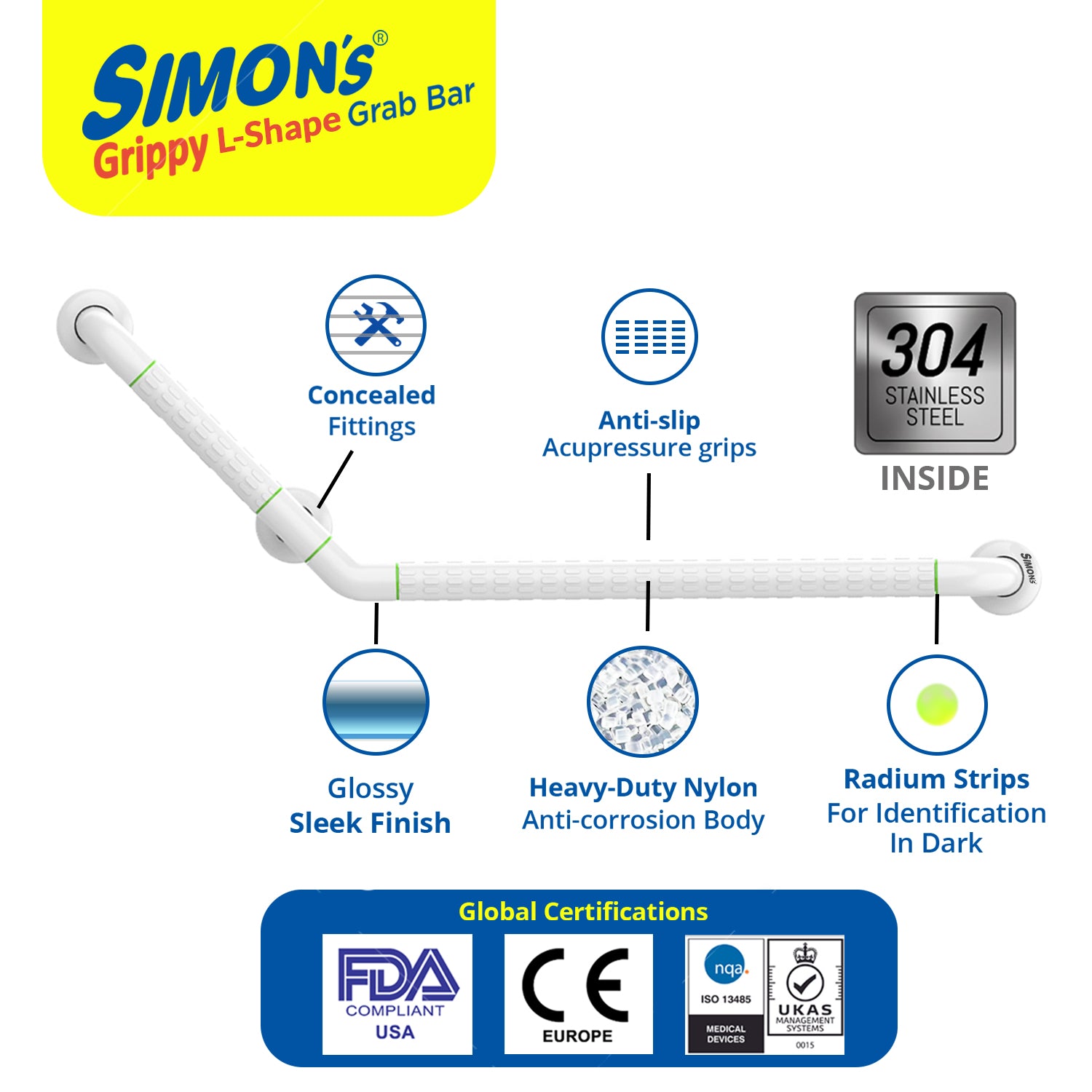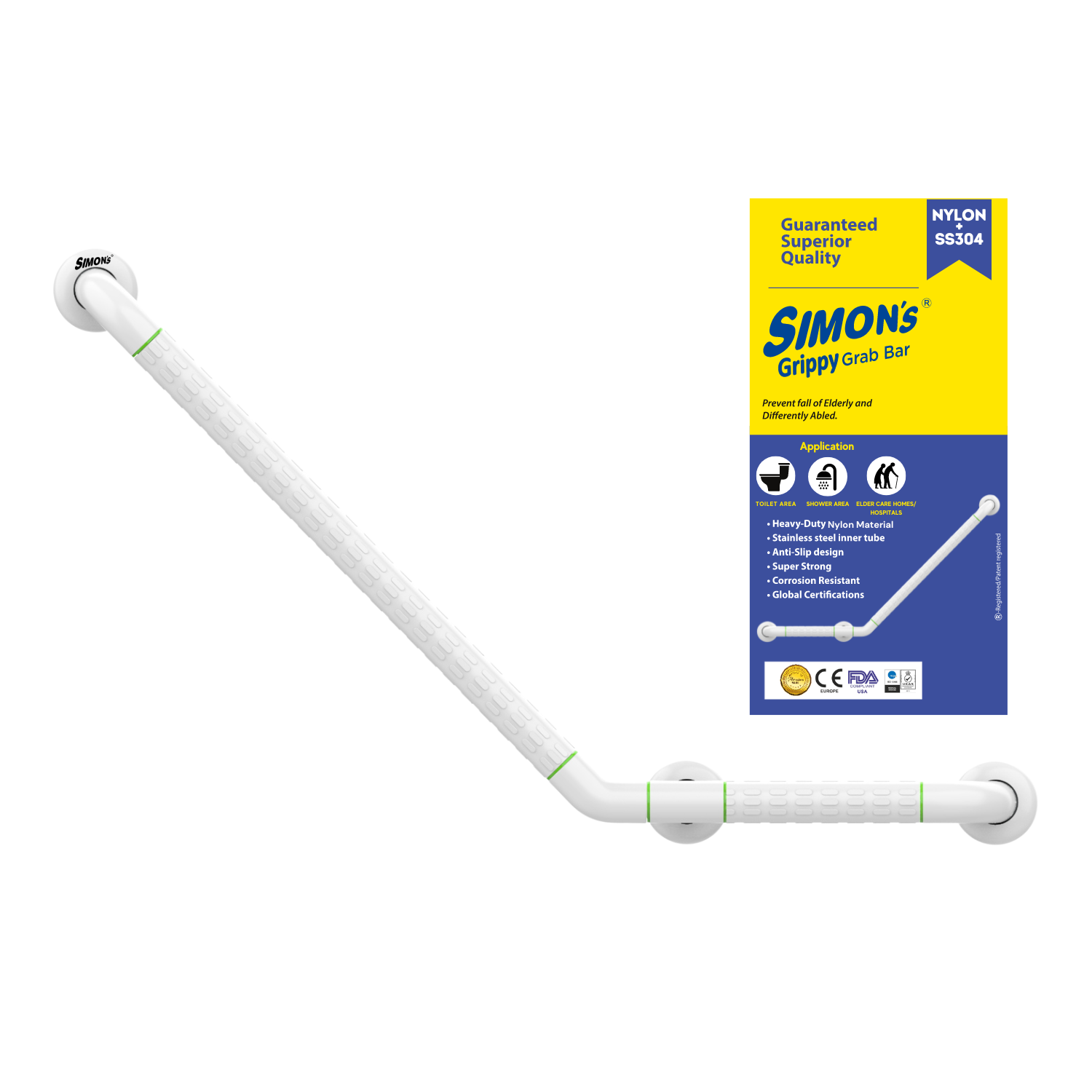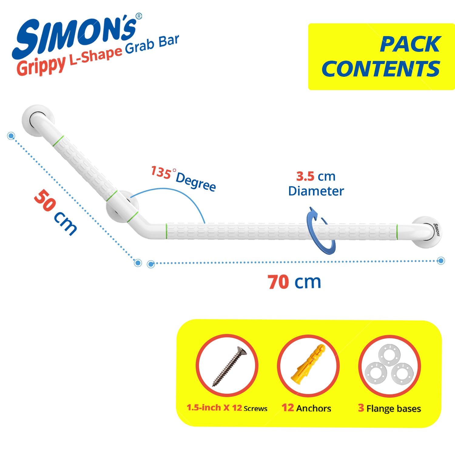 - Pack contains: 1 Simon's Grippy 35mm 135 Degree L-Shape Grab Bar White - 70 cm X 50 cm Length, 12 Screws of 1.5 Inch, 12 Anchors and 3 SS304 Flange, 3 Flange Caps, and 3 Concealing caps. The Simon’s Grippy Grab bar are suitable for usage by the elderly, handicapped/ disabled and patients requiring support to rise from sitting position in the toilet or support to stand while taking bath or for safety to hold and walk in the bathroom.