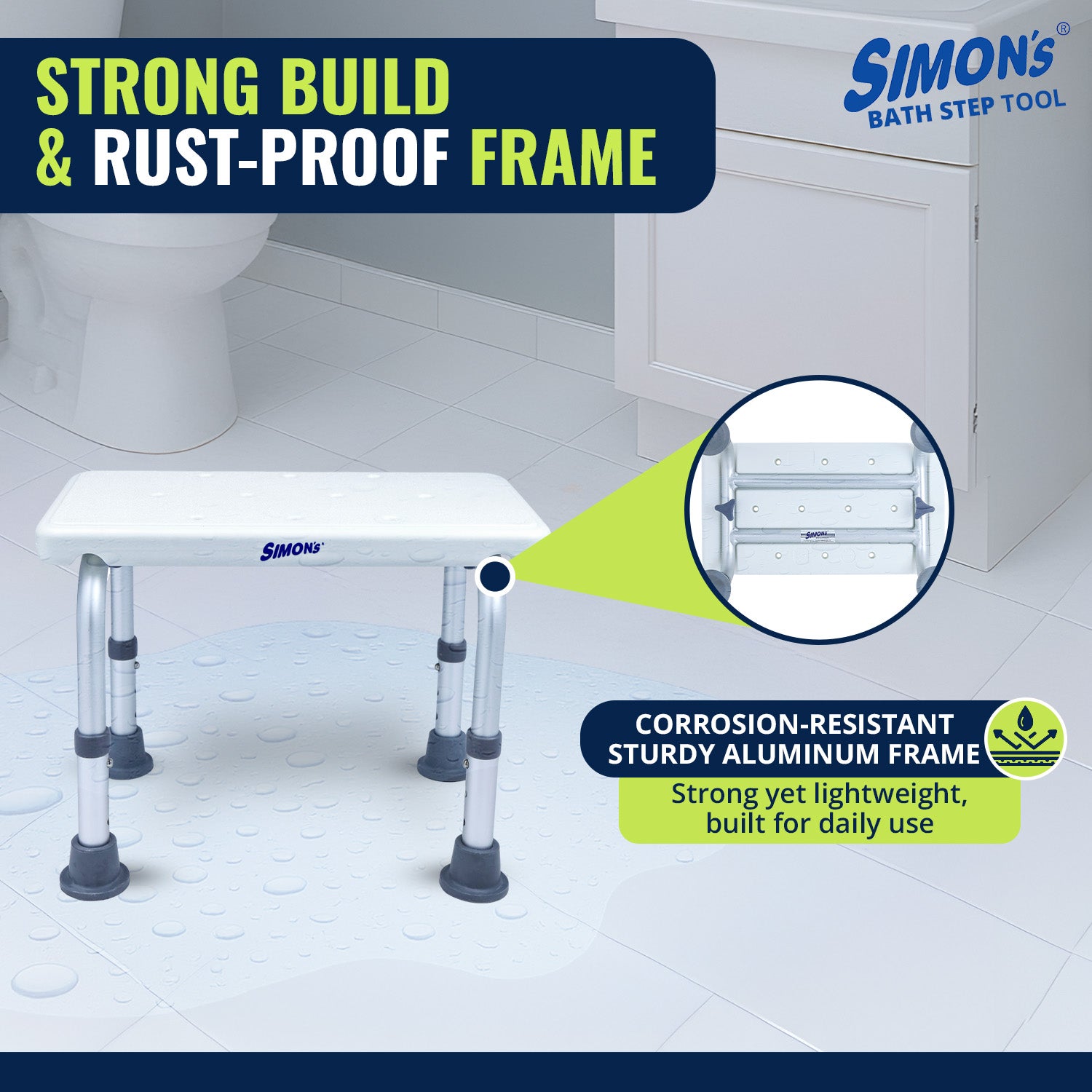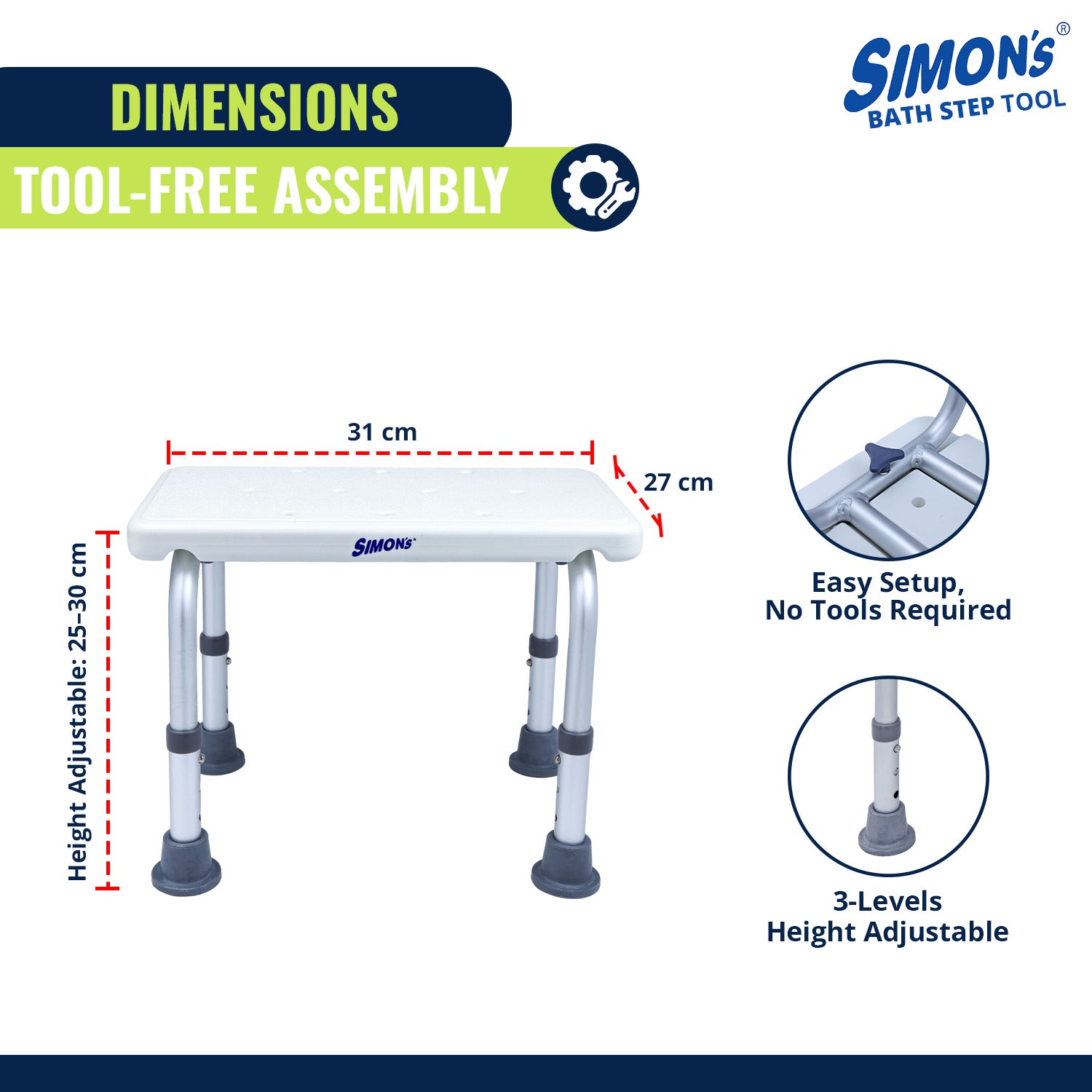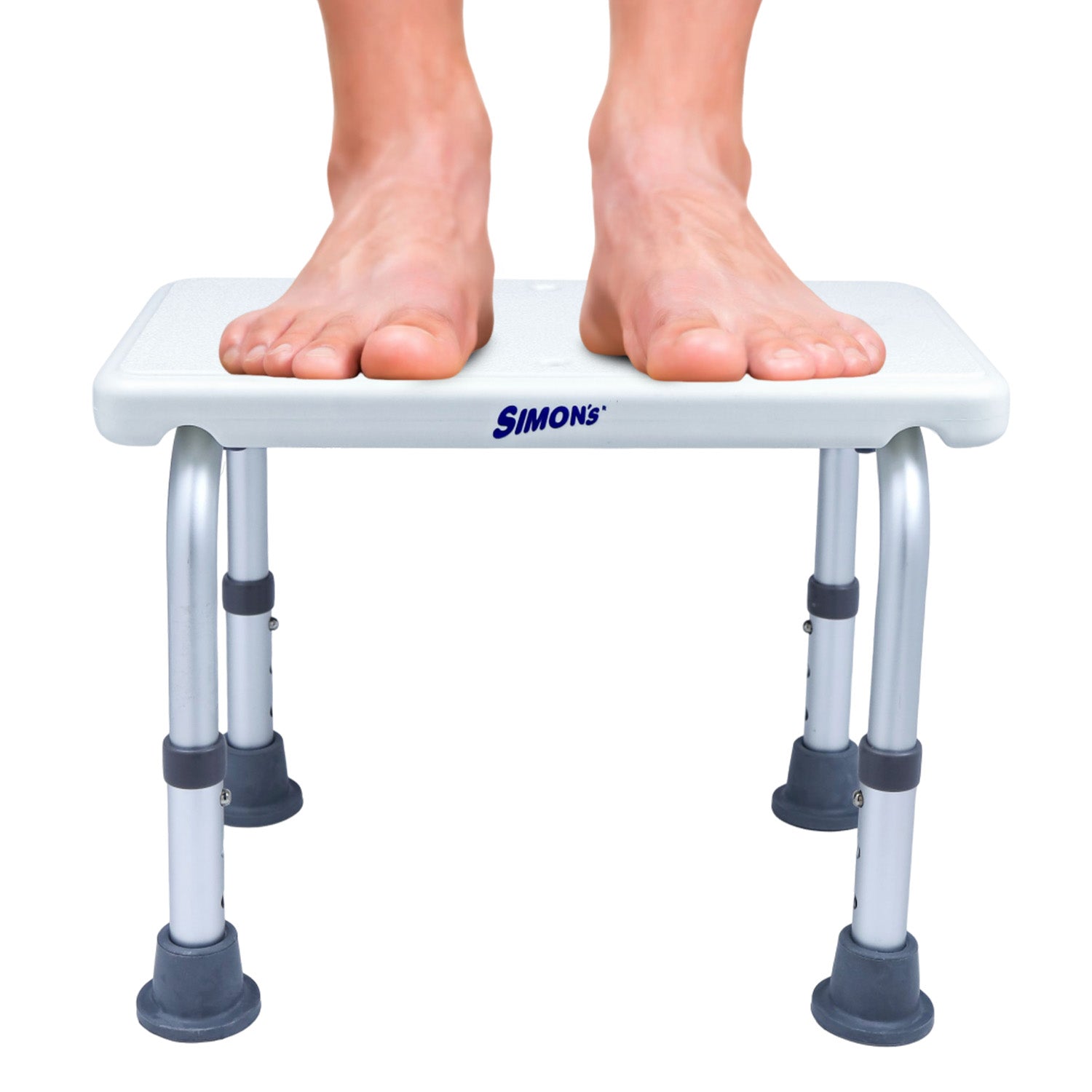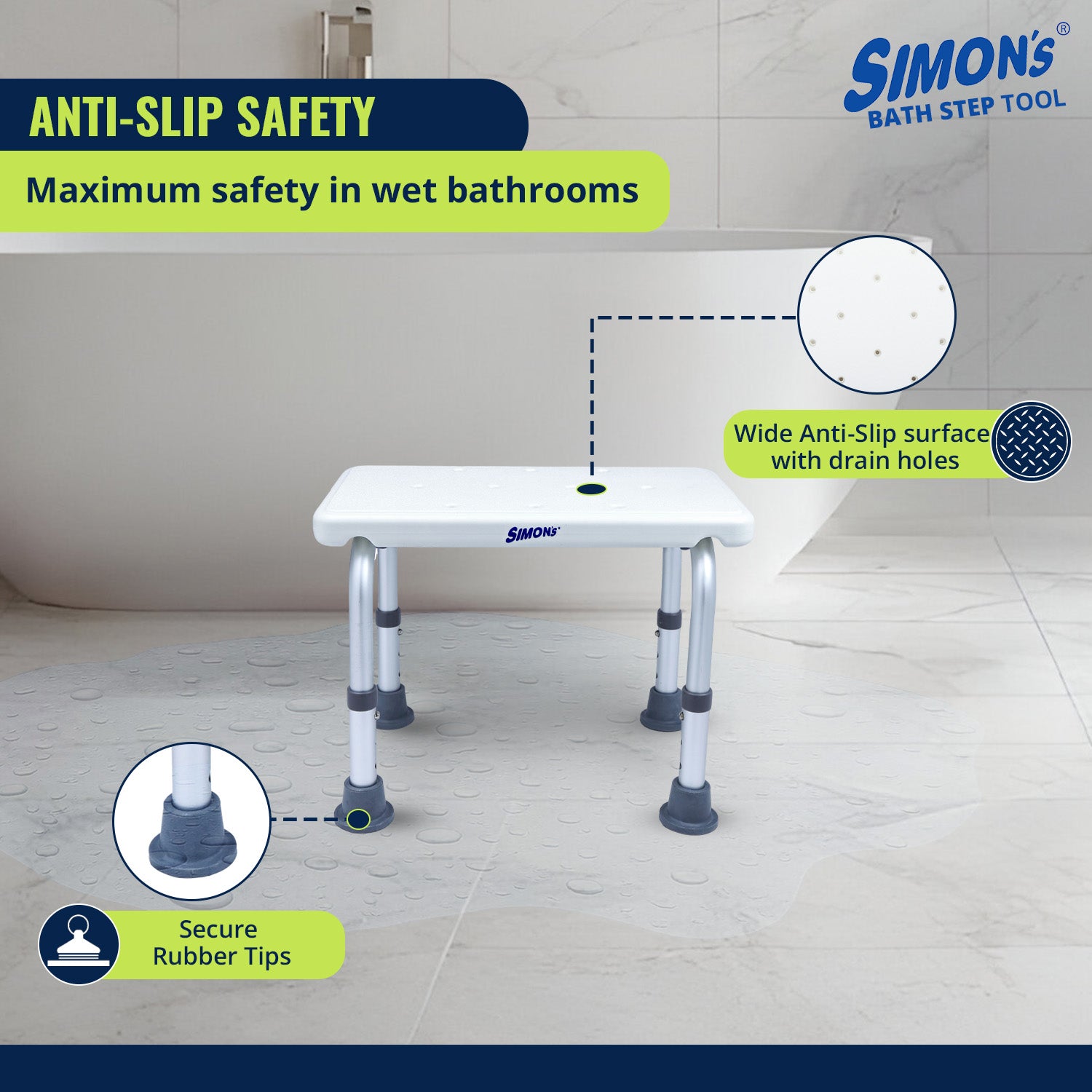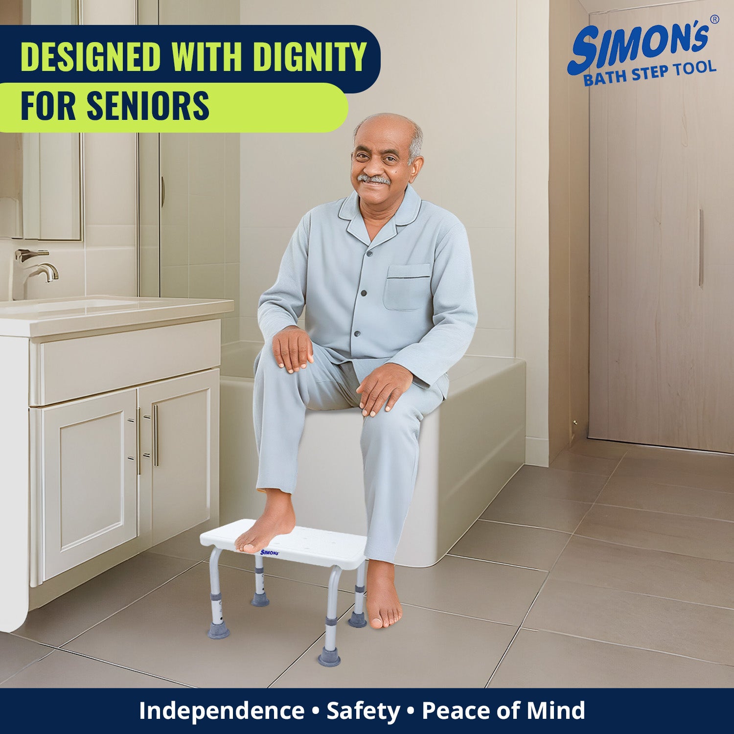- Essential Bathroom Safety & Hygiene Support Simon?s Bath Step Stool is designed to make bathroom use safer and easier for seniors. It provides a secure platform for stepping into raised bathrooms or bathtubs and can also be used to comfortably raise the leg while bathing for hygiene or medical cleaning needs. A must-have for elderly safety and dignity.