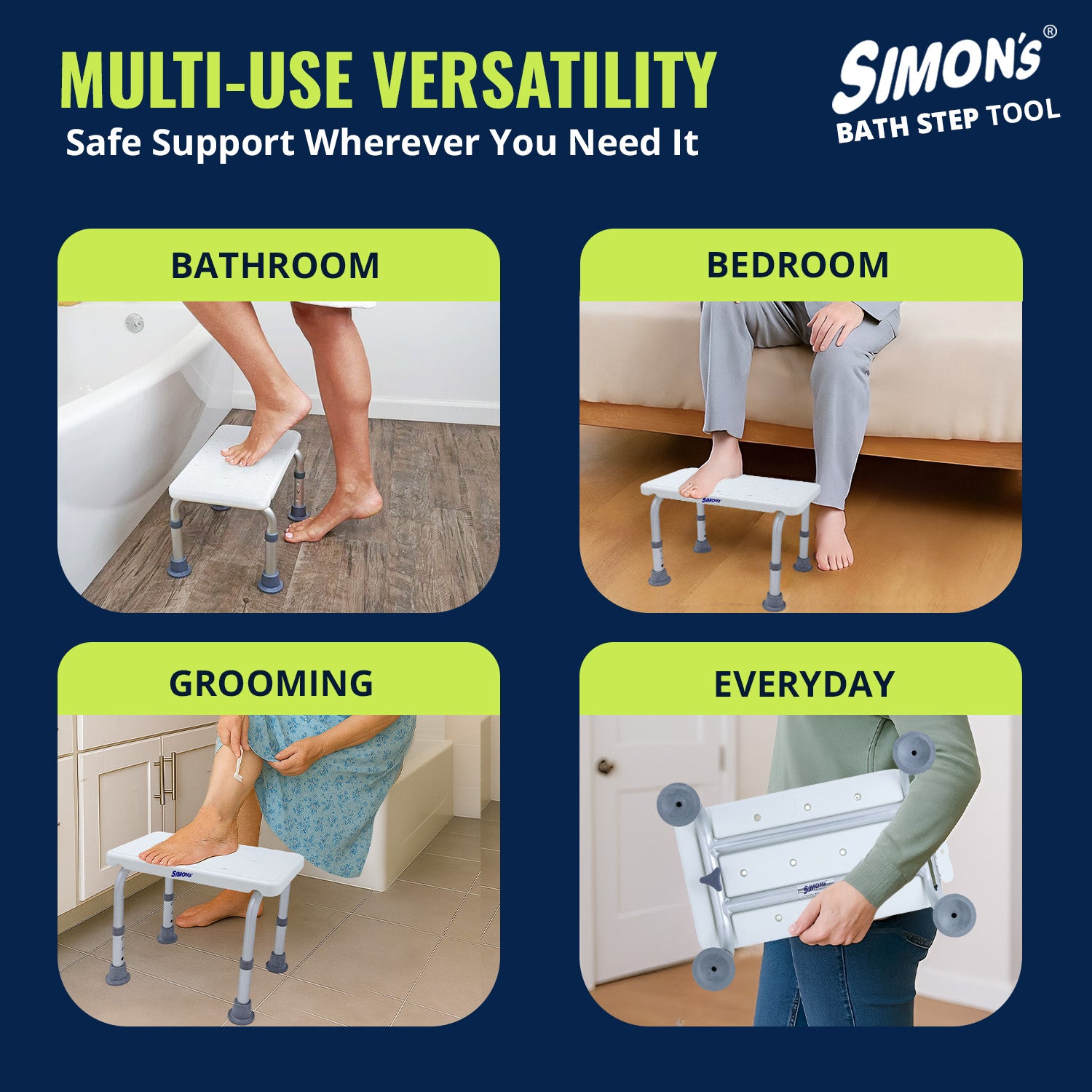 - Useful Beyond the Bathroom Though ideal for bathroom use, Simon?s Bath Step Stool is equally helpful beside the bed for easier entry and exit, as a leg rest during dressing or grooming, or even as a stable support step for accessing low shelves. Its versatility enhances elderly independence across different parts of the home.