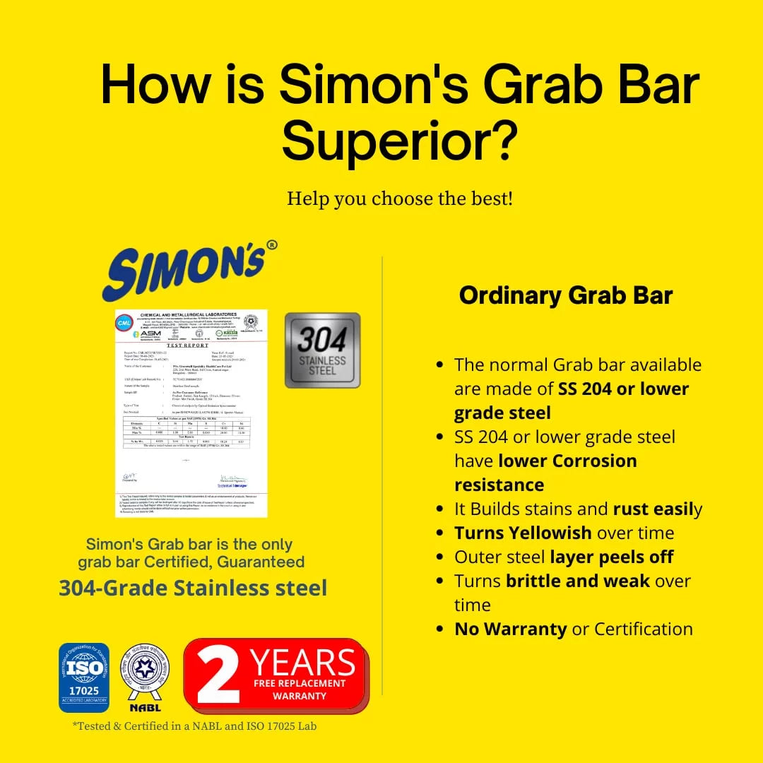 - Simon’s Grab bar handles are made of 100% Stainless steel material. The Simon’s brand handlebar is the only grab bar tested and certified 304-grade stainless steel.