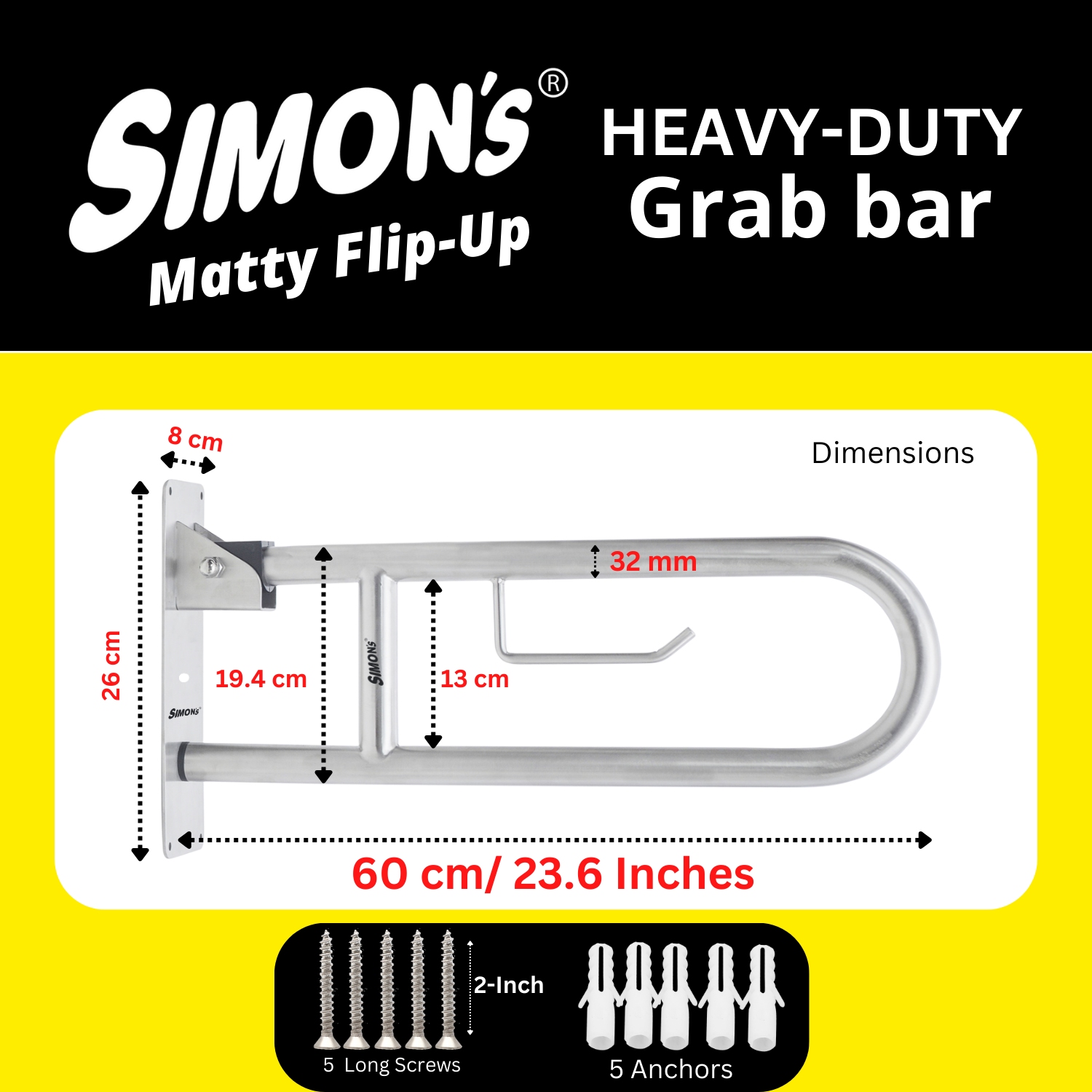 - Easy Fixing: The Grippy Flip-up grab bar comes with 5 heavy-duty 2-Inch-long Screws and anchors for high tensile strength fitting. It is extremely easy to fix, and comes with all the accessories required for fitting like screws, anchors, etc. All the accessories are of premium quality and finish. The Simon’s Grab bar provides a 2 Year FREE replacement warranty