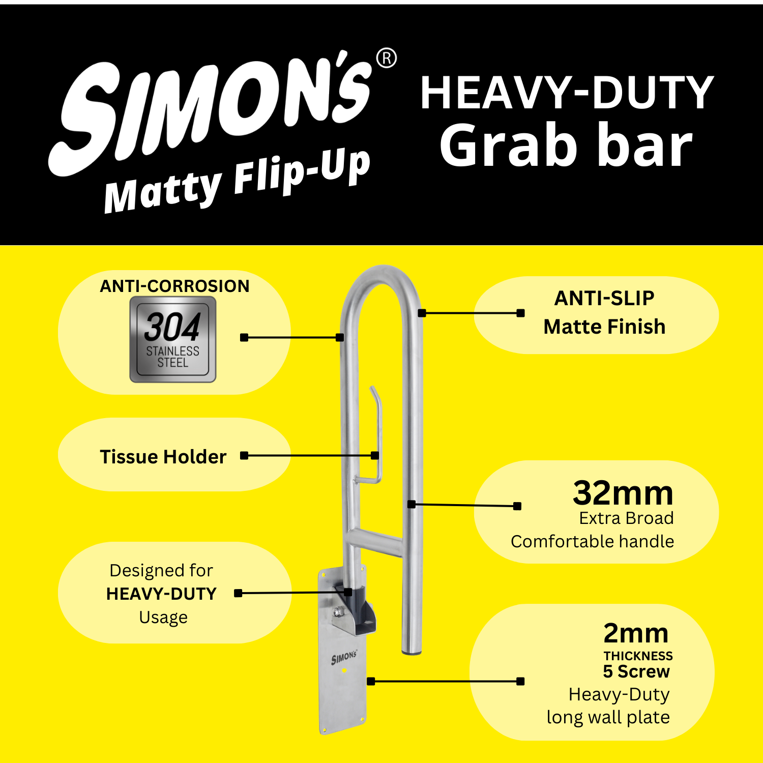 - Folding Grab bar: Simon’s Grippy Flip-up Heavy-Duty Grab bar is suitable for usage by the elderly and patients requiring support to rise from a sitting position in the toilet or to get up after a seated bath. The Matty folding Grab bar can be fixed next to the commode and can be easily placed down 90 degrees for usage and flip back and locked to the original position after usage, this would save space and enable easy movement.