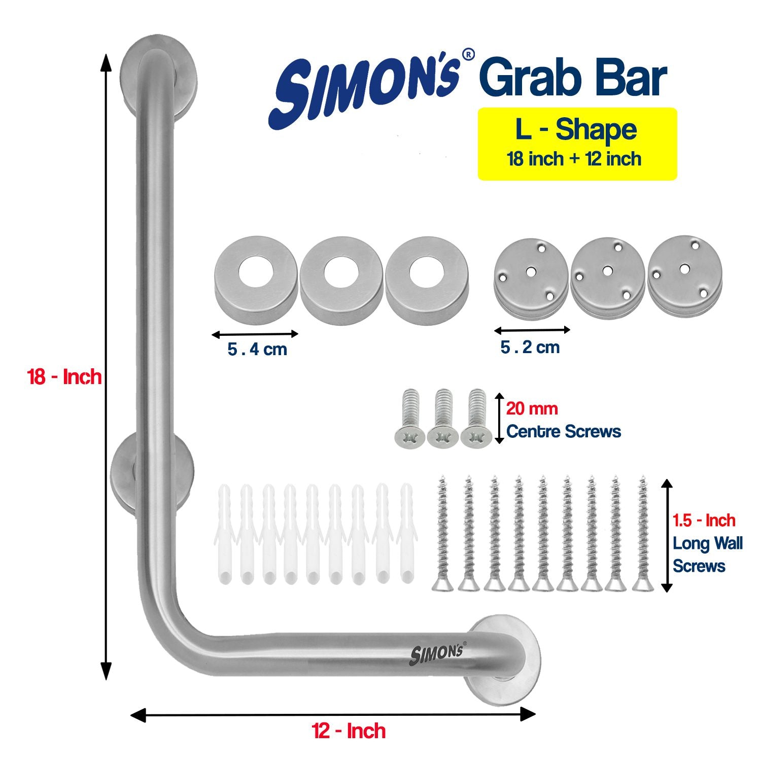 - The Simon’s stainless steel handle comes with 2 Years free replacement Warranty. Pack contains 1 L-Shaped 12+18-inch Stainless Handlebar, 3 flange, 3 concealing caps, 9 1.5 - inch screws, 3 20mm center screws and 9 screw anchors