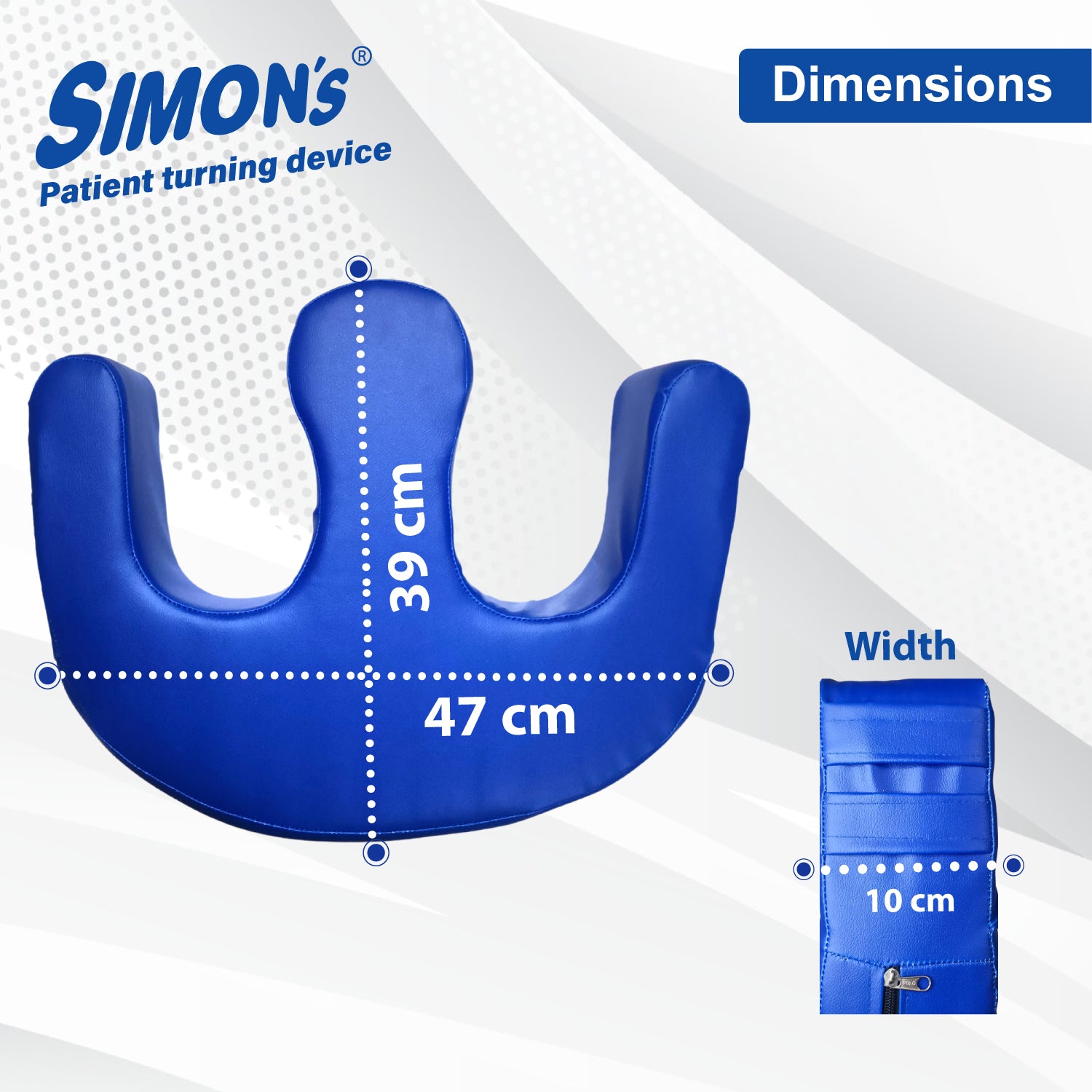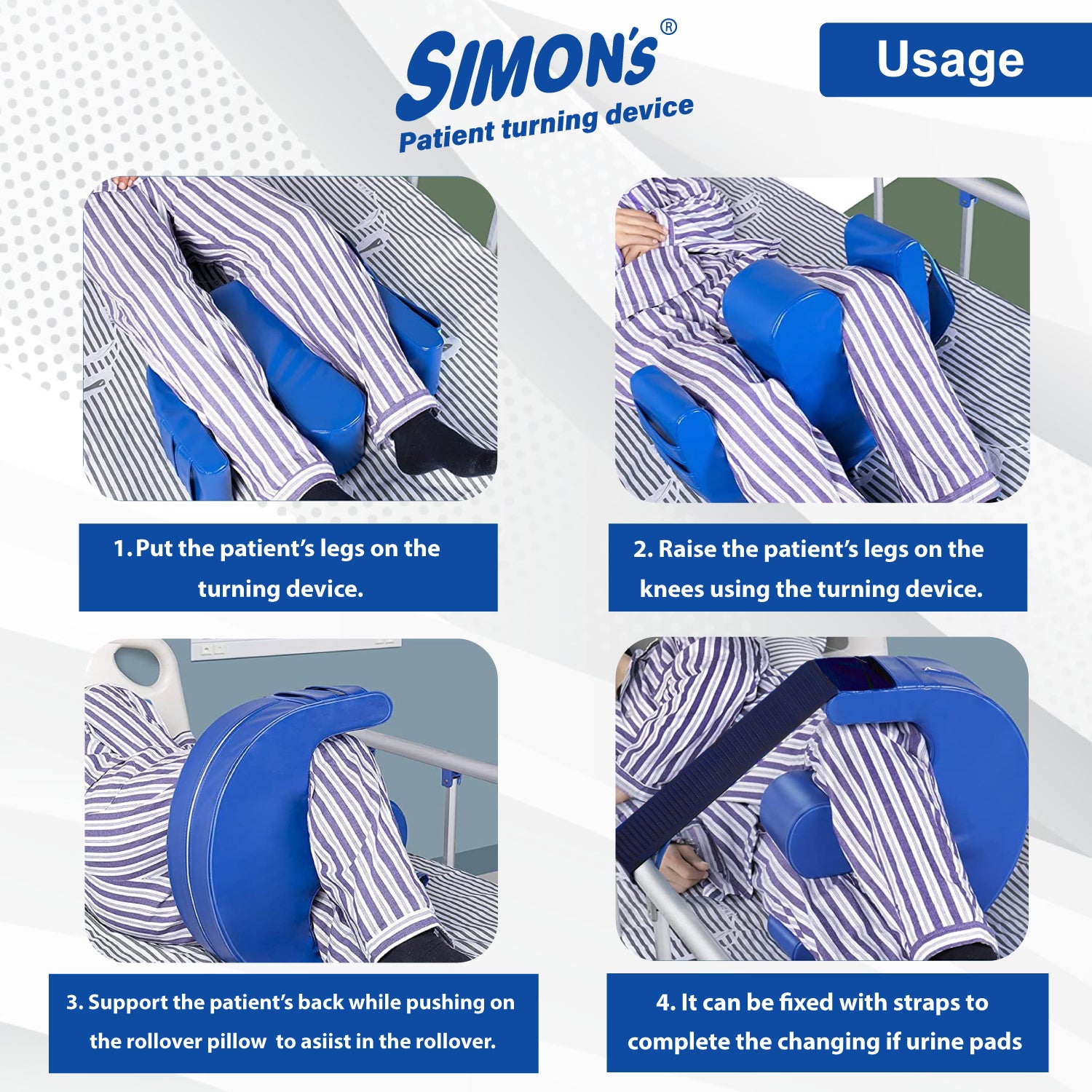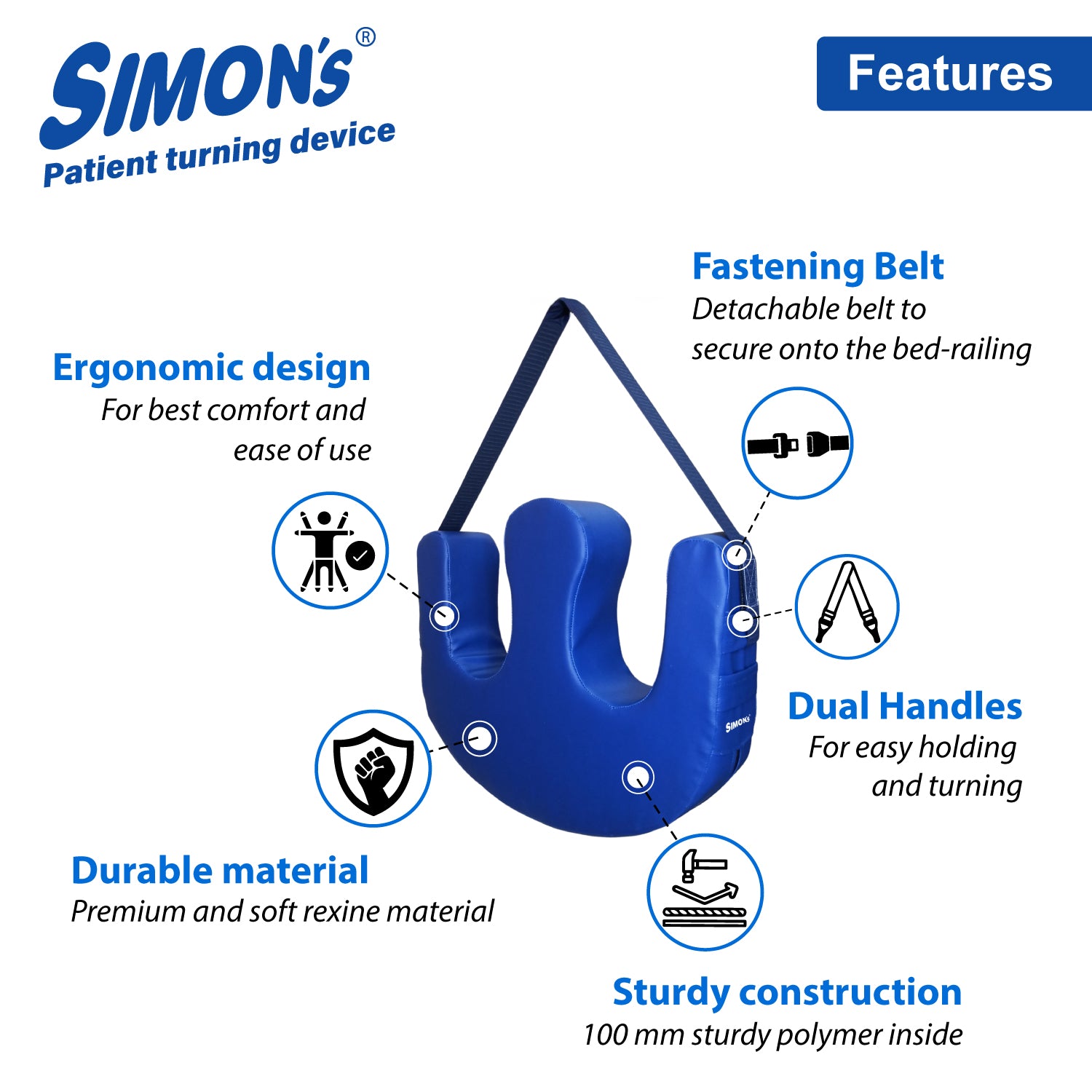 - Fastening Belt: Simon’s turning device comes with a Velcro detachable strap that can be used to secure the pillow to the side bed railing, keeping the bedridden patient in a turned position. The strap can be detached and fixed on either side of the turning pillow, depending on the side to which the patient is being turned.