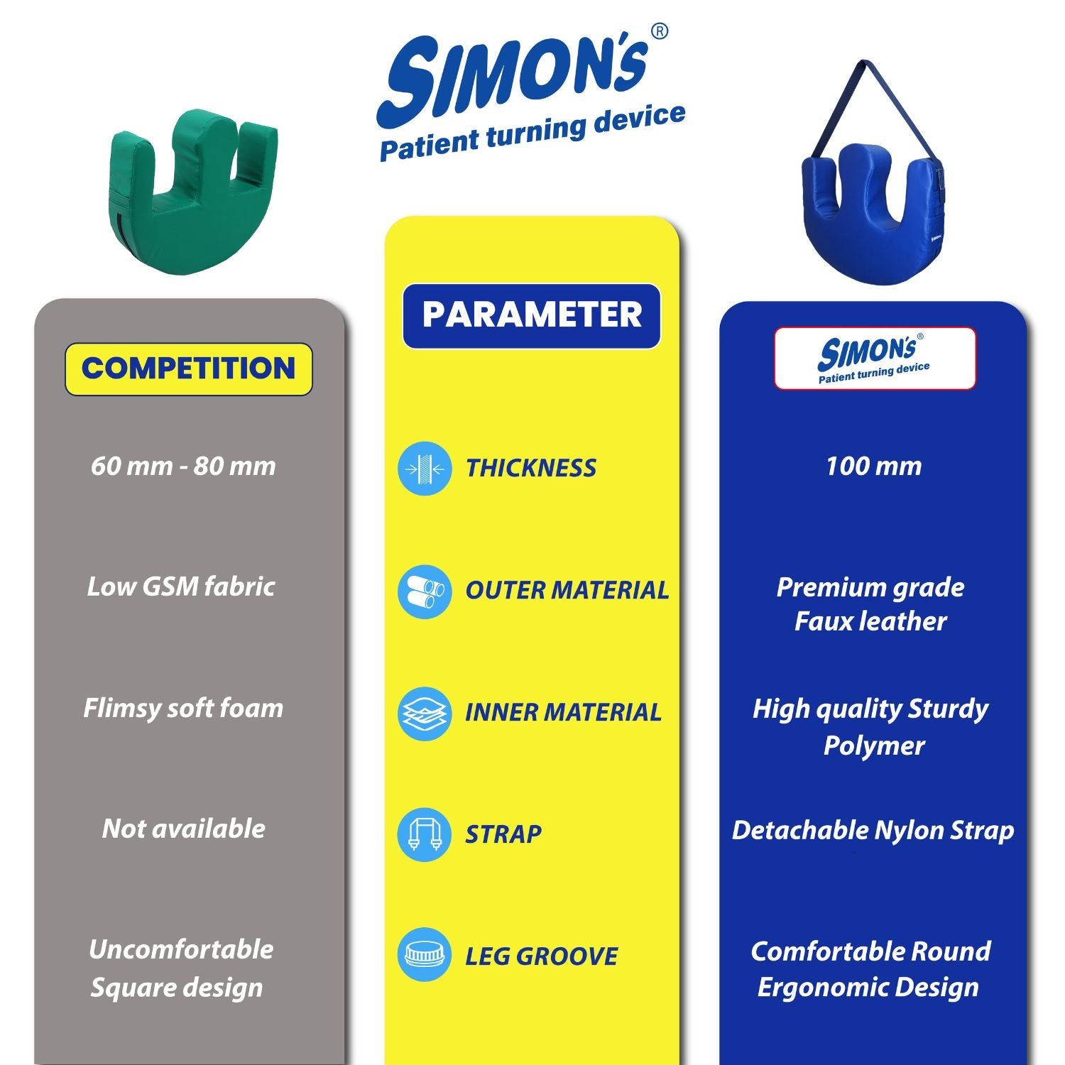 - Ergonomic Design: Simon’s turning device is ergonomically designed to provide the best comfort to patients and ease of use for caregivers. Its base is a perfect semi-circle, enabling a smooth turning experience. The rounded U-shaped leg grooves with a bell-shaped center give a perfect snug fit once the legs are placed inside. It is sufficiently broad with a 10 cm thickness for stability and ease of turning even heavy patients.