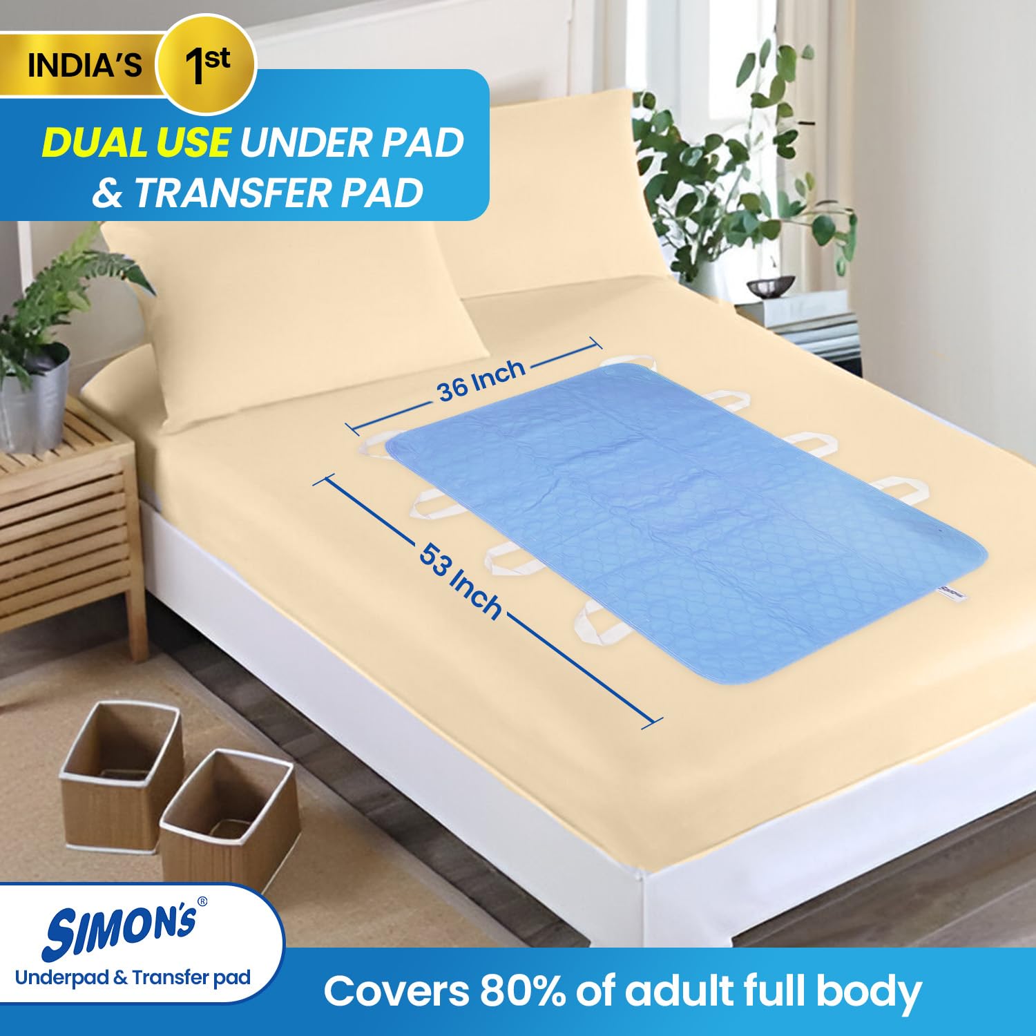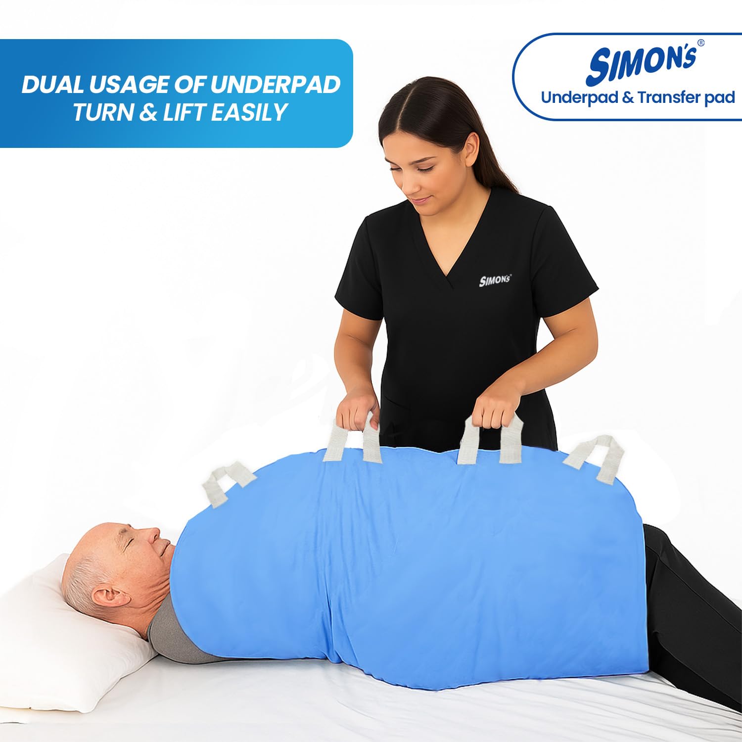 - Designed for Elderly & Multipurpose Use: Simon?s Underpad with Handles is India?s 1st dual-use underpad thoughtfully designed for elderly care. It not only absorbs urinary leakage but also assists in essential daily tasks like lifting, turning, sitting up, diaper changes, dressing, or changing bedsheets?without disturbing the user. Perfect for dependent seniors, post-surgery recovery, or palliative care.