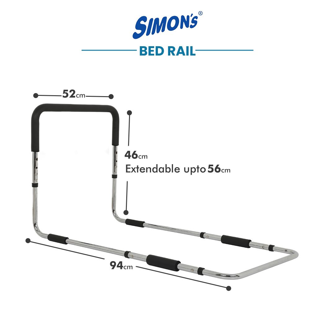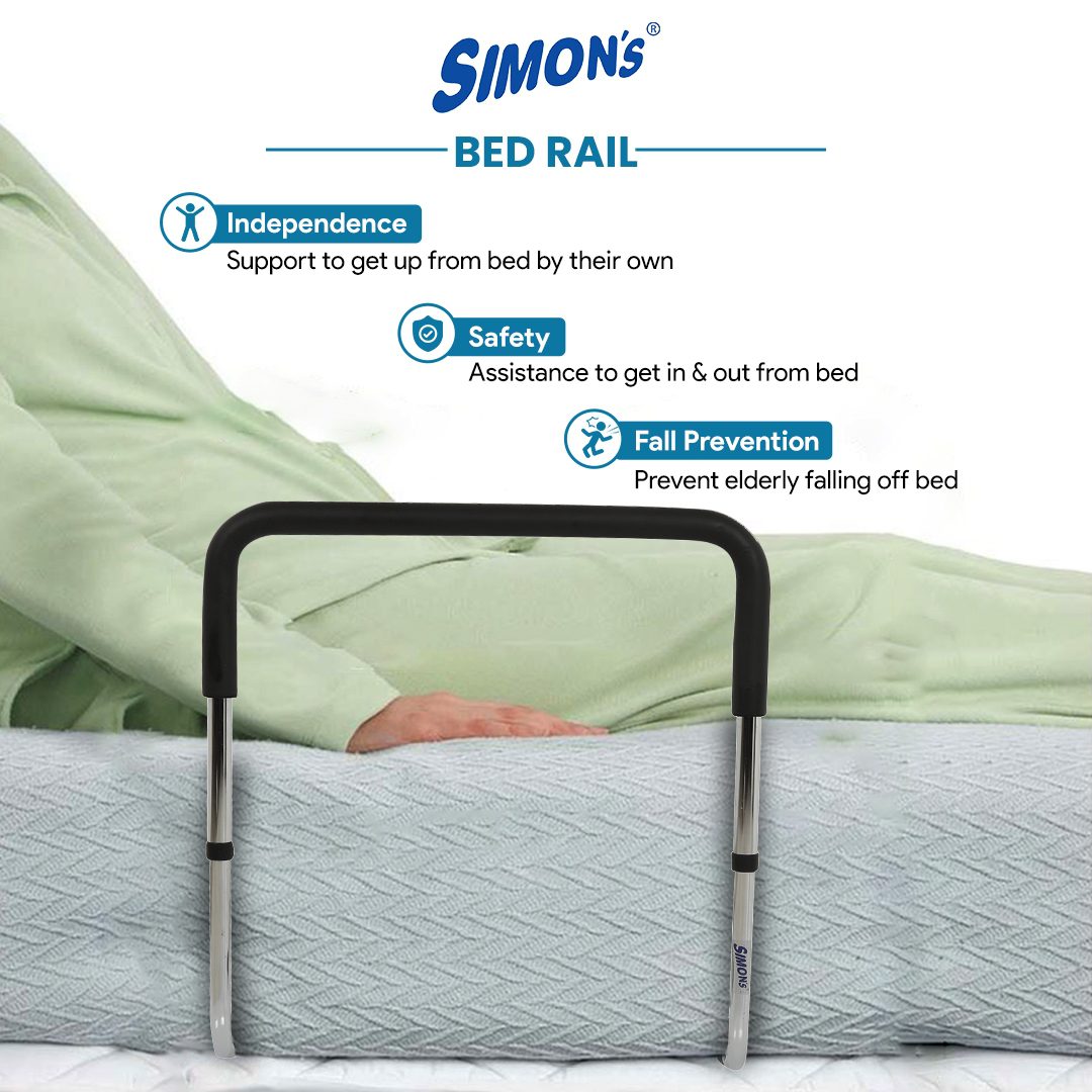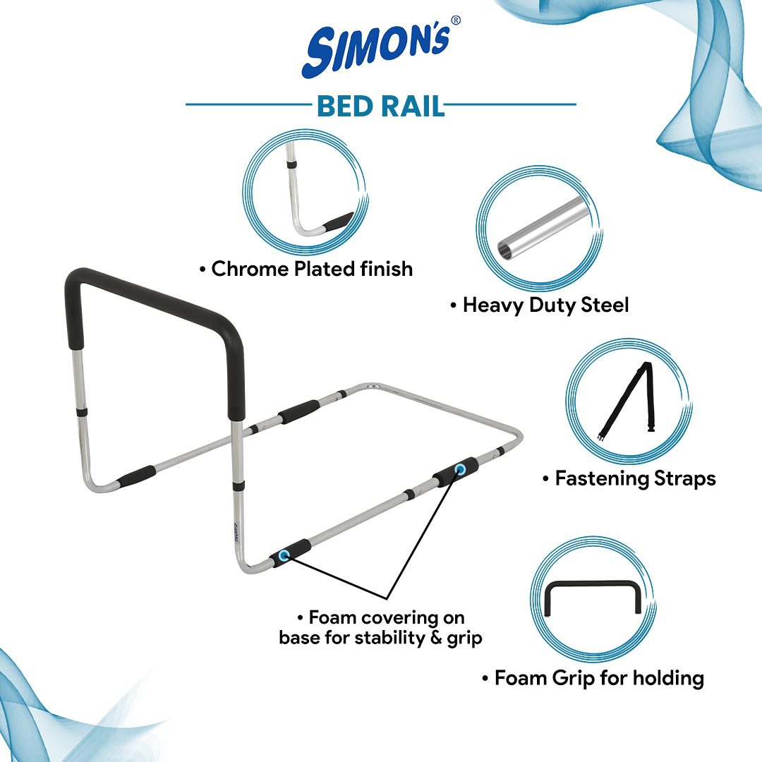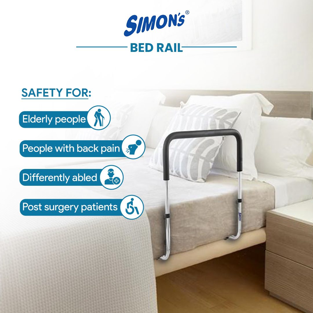 - Simon’s bedrail is made chrome-plated robust stainless steel material, designed for the elderly and adults for prevention from falling off the bed. The bed railing is also extremely useful for old people who find it difficult to get up from bed and require assisted rising.